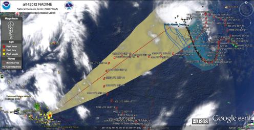 Although I do not have any means of collecting a ULF signature at this time for either the hurricane or the seismic swarm to match them up (or even know for sure that they have one), I will make a prediction anyway for the intended destination of Tropical Storm Nadine at this time. Depending upon how “interacting” the particle is with the ocean and atmospheric currents as it grows in mass and momentum, this will dictate how quickly the low pressure system can move towards the seismic zone and possibly whether it can get there at all before it gains enough mass that its orbit takes it below the ocean’s surface.