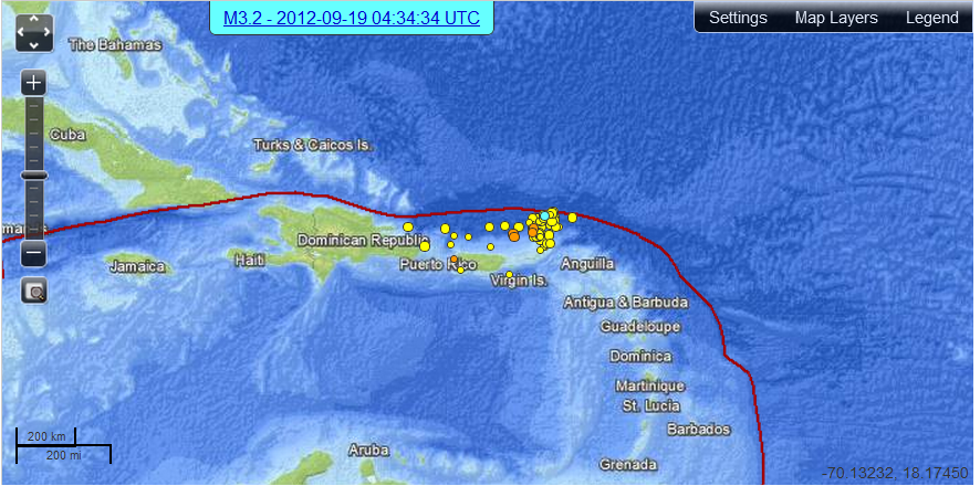 9-29-12 Update: After performing a 360 degree cyclonic loop, Nadine is again being pushed NW. Some models show she may actually do another loop. Nadine remains as a Hurricane. Based upon my observation and theory, I will make the judgement at this time that the massive particle, although weakly interacting with each orbit, is subject to the momentum of the ocean’s currents which are pushing the exit point from the ocean to the north/northwest. Why then would the particle’s entry point into the earth stay locked in near the spot NW of San Juan where the seismic activity is occurring? I would have to say that the particle charge must create a large potential voltage difference with each orbit which guides it back on target as it orbits back through the atmosphere towards the entry point. If the orbit decays into the ocean before Nadine can make it to her destination, she will die. She still appears to have plenty of fight left in her.