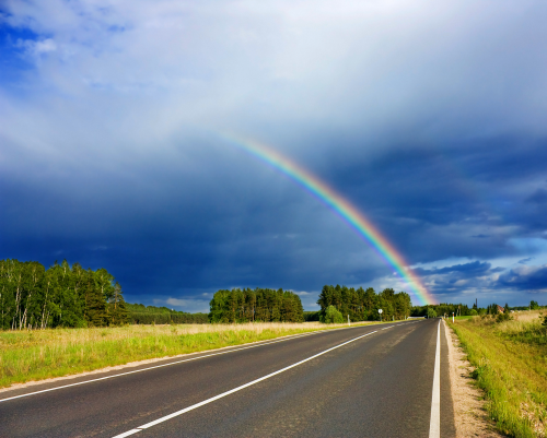I drove through a rainbow once, early morning mid-winter, just south of San Fransisco, CA., along the San Andres fault. The east leg was right on the side of 280 (or is that 285?). As I approached, each rain drop threw of a prism of rainbow light, so there were thousands of little rainbows filling my vision field. When I got to the leg itself, there was a radiant “ball” of white light at the base, and it seemed as if the water was bending and focusing the white light in one spot. Quite the sight.