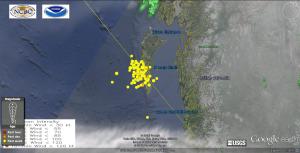 Interestingly, depending upon the depth of the particle, my research shows the particle may also orbit through the oceans and can trigger mammal and fish strandings and kills, possibly creating a shockwave in the non-compressible ocean water with each orbit.  The seismic activity near Massett, Canada seems to be 10km-20km below ground so it is probably also orbiting below the ocean in the Northwest Pacific.
