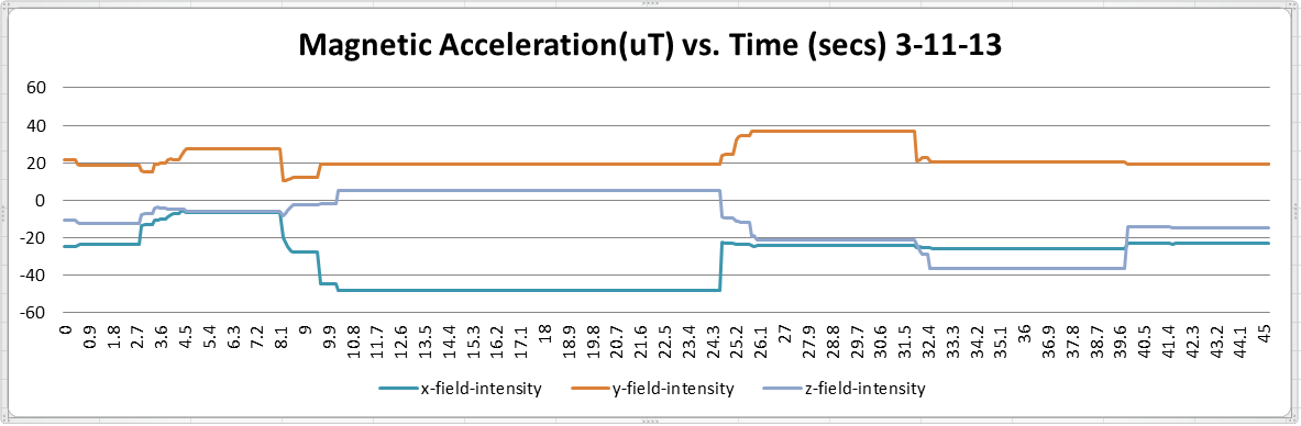 I notice that the sound on my radio keeps blinking off and on so of course being the geek that I am I pull out my sensorscope magnetometer app on my iPhone to see if I can pick up any magnetic interference and this is what it displays.