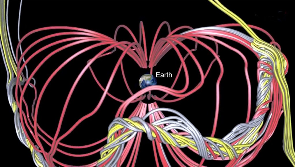 Earth’s magnetic field lines (pink) tie in directly with the sun’s (yellow) at portals located in the sun-facing side of our planet’s magnetic bubble. The resulting connection sends solar wind particles straight into the upper atmosphere. Credit: NASA