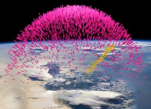 An artist’s impression of a terrestrial gamma-ray flash, called “dark lightning,” originating from a thunderstorm. The gamma rays (pink), in turn, generate electrons and positrons (yellow and green), their antimatter counterparts, which get blasted into space.