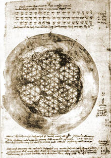 Leonardo da Vinci studied the Flower of Life‘s form and its mathematical properties. He drew the Flower of Life itself, as well as various components such as the Seed of Life. He drew geometric figures representing shapes such as the platonic solids, a sphere, and a torus, and also used the golden ratio of phi in his artwork; all of which may be derived from the Flower of Life design.[2][10][11][12]