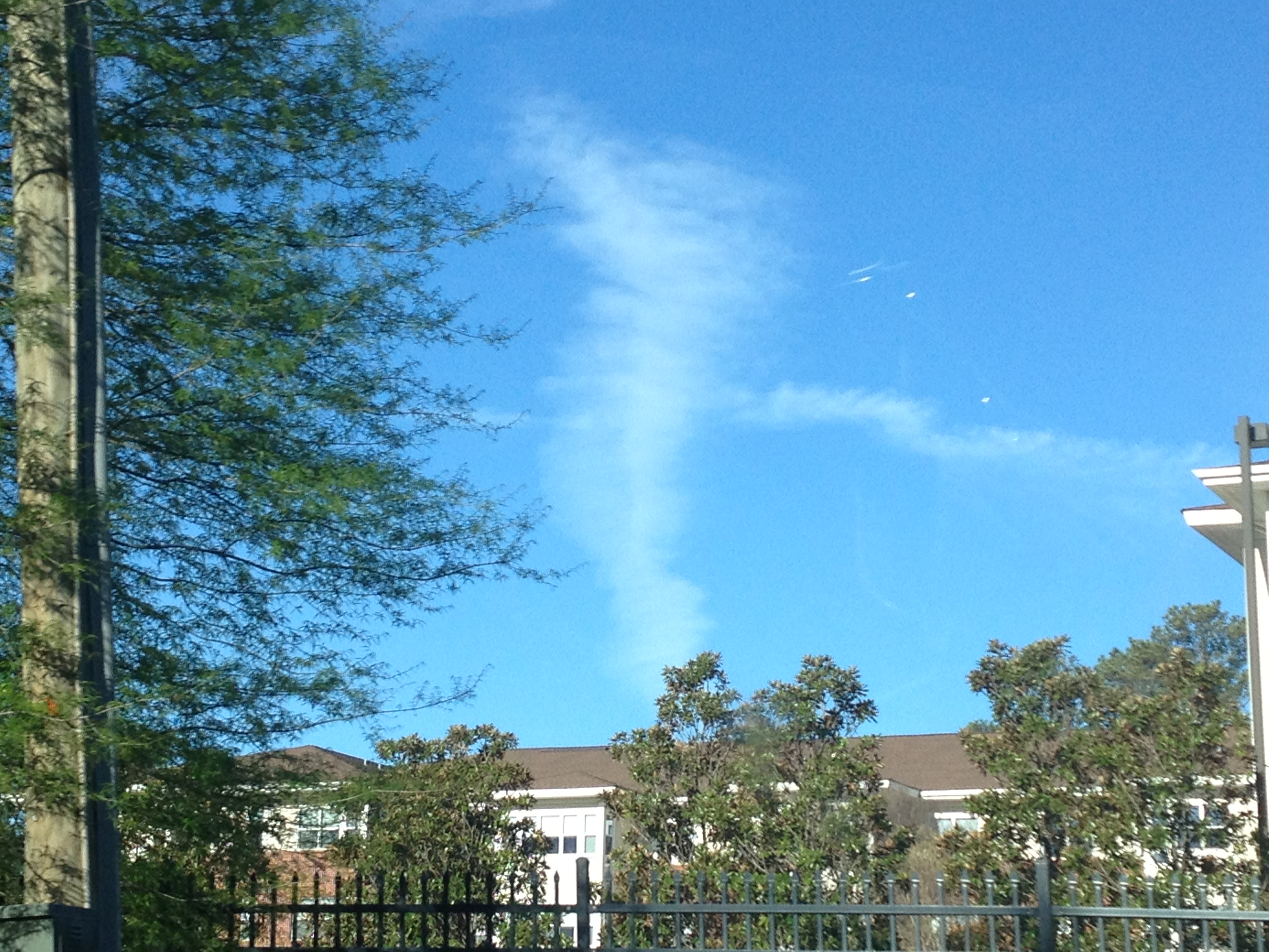 At 8:00 AM ET Saturday morning, the skies over Roswell, GA, which is not in an active flight path, were clear and crisp. At 8:30 AM as we were heading to a baseball game I took the following photos of this peculiar sky to the West (I was not at the wheel while taking these pictures with my IPhone):
