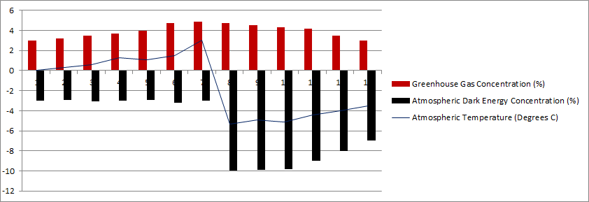 The second graph is mine which shows greenhouse gas concentration, dark/vacuum energy concentration and global temperature (Delta Temperature Change -Degrees C is the scale on the left, % is on the right – not shown) . In my model, it is a sudden increase in vacuum energy concentration (I am showing it negative since a vacuum is negative pressure, just for visual) which causes the temperatures to plunge suddenly in the atmosphere. We know the atmosphere can do this because even today, as global temperatures rise, we still have severe cold fronts and cold “snaps” on Earth.