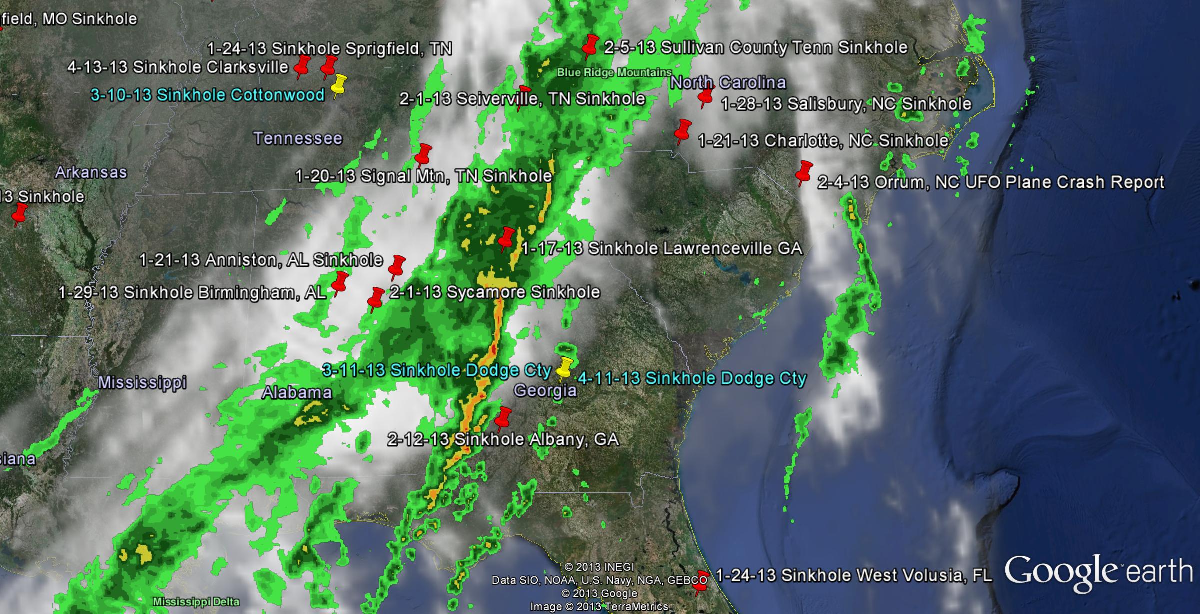 When I got home I dumped a Google Earth weather screen shot to go along with the readings. I have collected data on clear days and so far I do not get these quick, wild swings in the magnetic fields. Hell, if you look at the Doppler Radar these fronts even look like strings, at least to me. Just thought I would share…