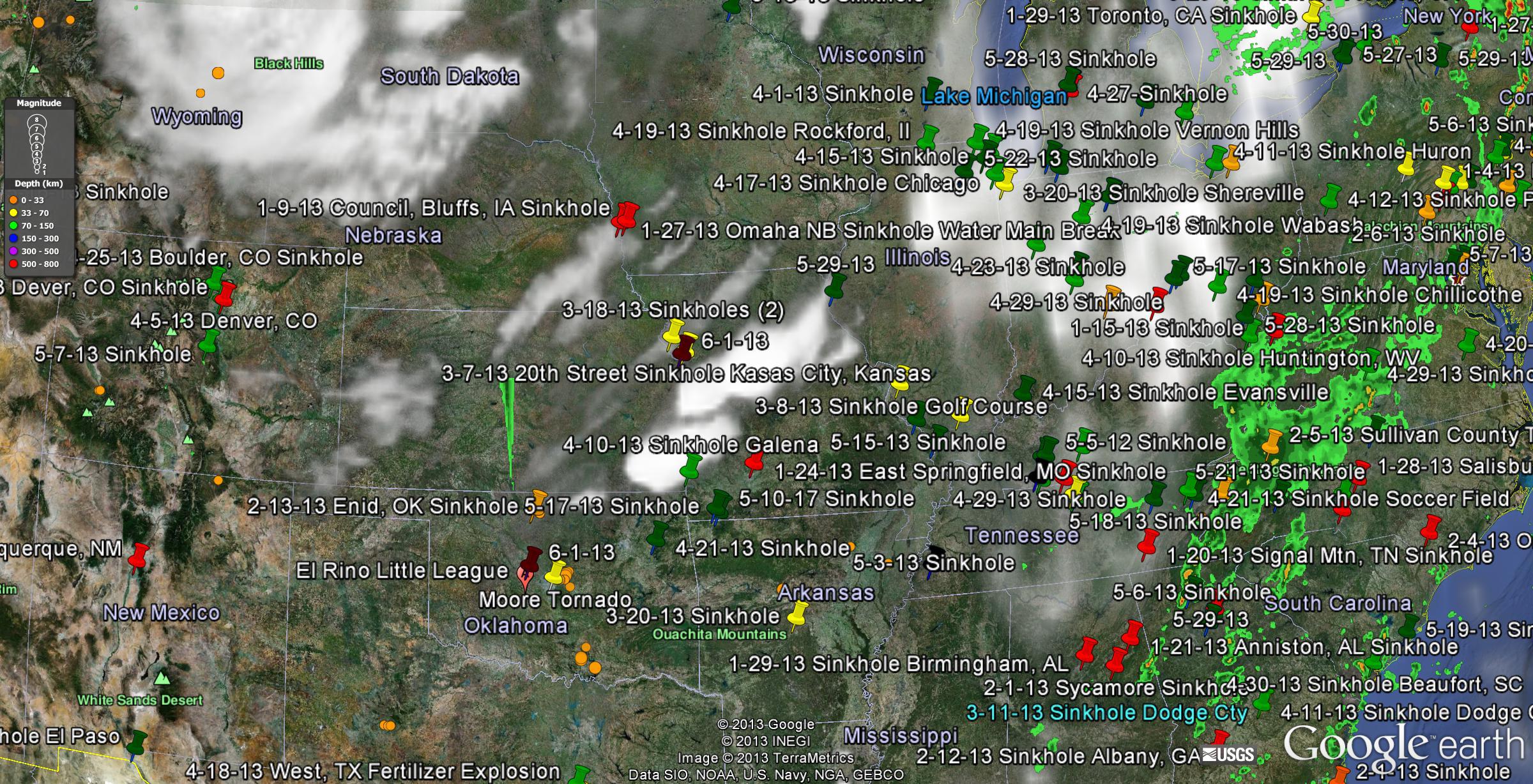 5-31-13 Weather: Red Pins: January 2013 Sinkholes (mostly dormant now)