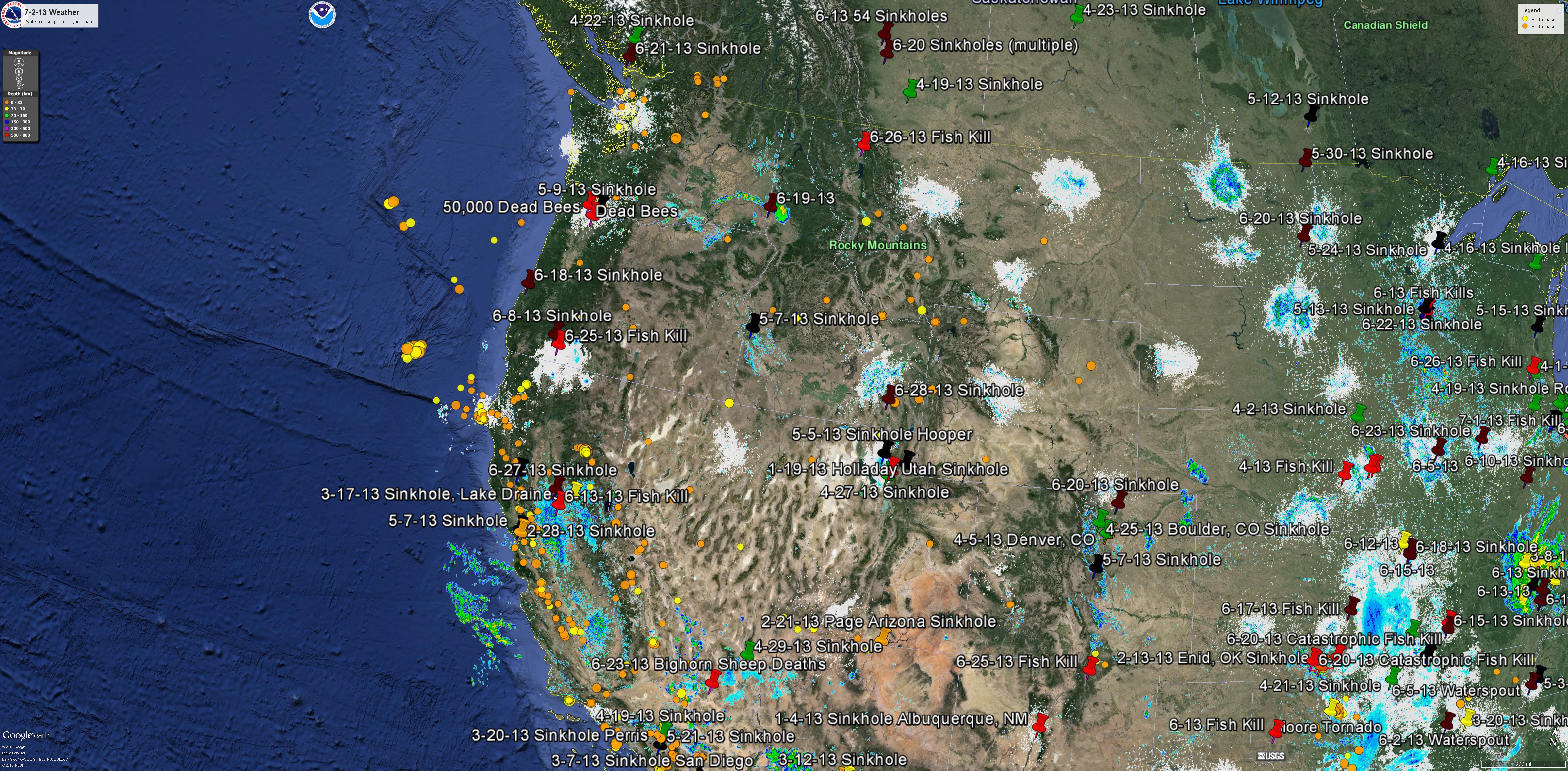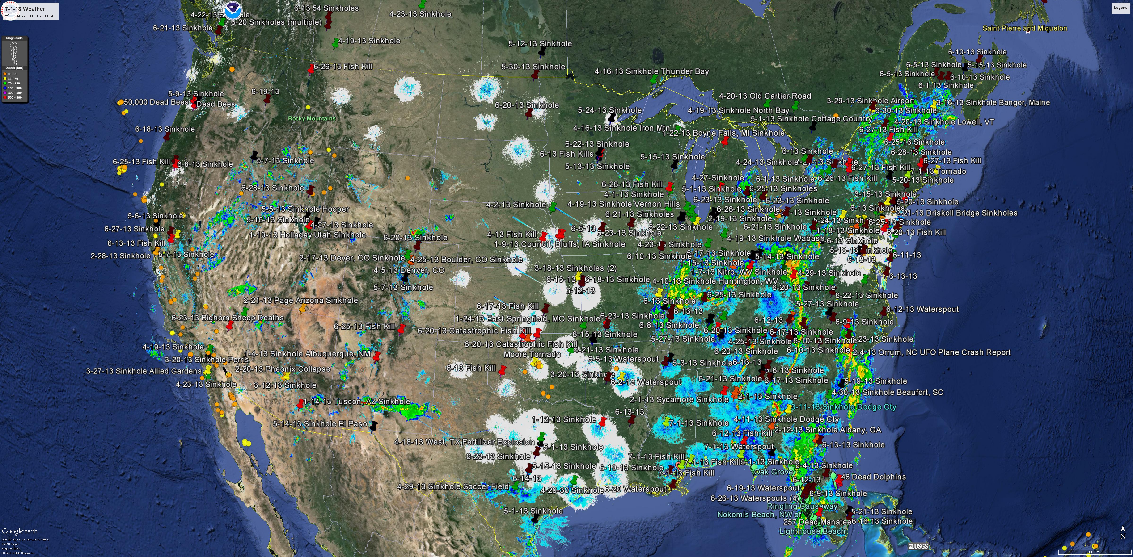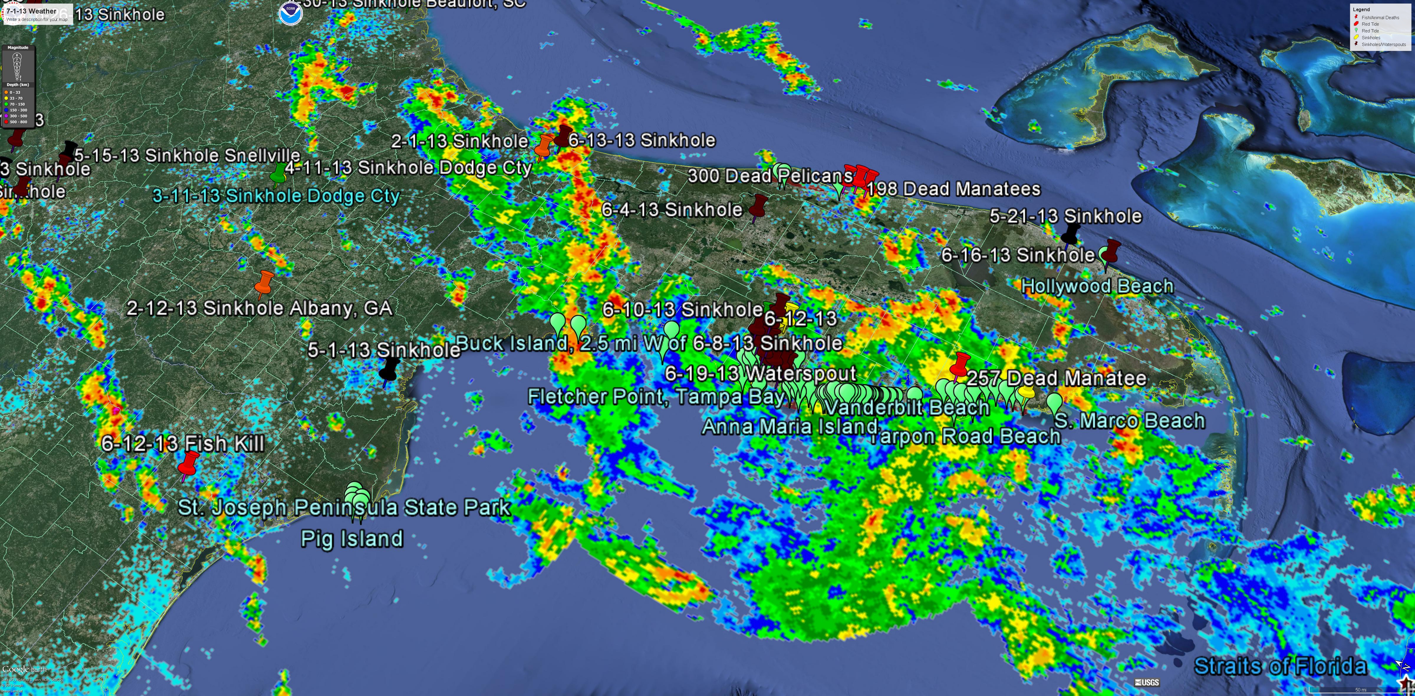 I try to let my thoughts flow on this blog and share whatever pops out of the quantum vacuum between my ears. They are telling me that our Sun is very good at colliding and collapsing that hydrogen and curling it up into these little energetic particles at all different energy levels and spewing them out into her surroundings, gradually and continuously collapsing space. They decay and evaporate, some possibly popping back out as protons/atomic hydrogen, ready to do it all again sometime in the future. Rinse, wash and repeat. But while they are decaying they appear to trigger all sorts of phenomena in the space around them. I have it stuck in my head that they can first gradually ionize their surroundings, turning normally inert Nitrogen into atomic Nitrogen allowing it to combine with some of that atomic Hydrogen, maybe forming ammonia (NH4) which was sampled in this fish kill and also found in ice cores during Tunguska. It could also ionize Oxygen in the atmosphere and could give you the Nitrates (NOx) also sampled in the ice cores in that same article. It might even ionize the dissolved Oxygen in the water, reducing oxygen levels and triggering fish kills like this one currently going on. Scientists will tell you it is warm water temperatures or algae doing that, but temperatures change all of the time, and at atmospheric pressure (1 bar), dissolved oxygen levels do not change that much with temperature. Or, if I use my imagination, the magnetic field disturbance along the particle string’s surface might confuse bees that follow those magnetic field lines for navigation home. If these invisible strings do exist, they might enter into the waterways and conduct electromagnetic disturbances deep below the surface, paralyzing fish and mammals, like what is happening now in Florida, where there has been severe weather this year. These strings would also explain why NASA’s Fermi Telescope was magnetically connected to a storm 2800 miles away. And lastly, those energetic particles might gradually decay the Earth and trigger those sinkholes that are shutting down highways everywhere and triggering shallow Earthquakes, like those in Washington State. Now if I was correct, then these dark/vacuum particles might leave a signature, possibly vacuum condensing water vapor in the atmosphere along their path, showing up as reflection on Doppler radar or possibly as cloud tracks and jet streams along their paths, as I show below.