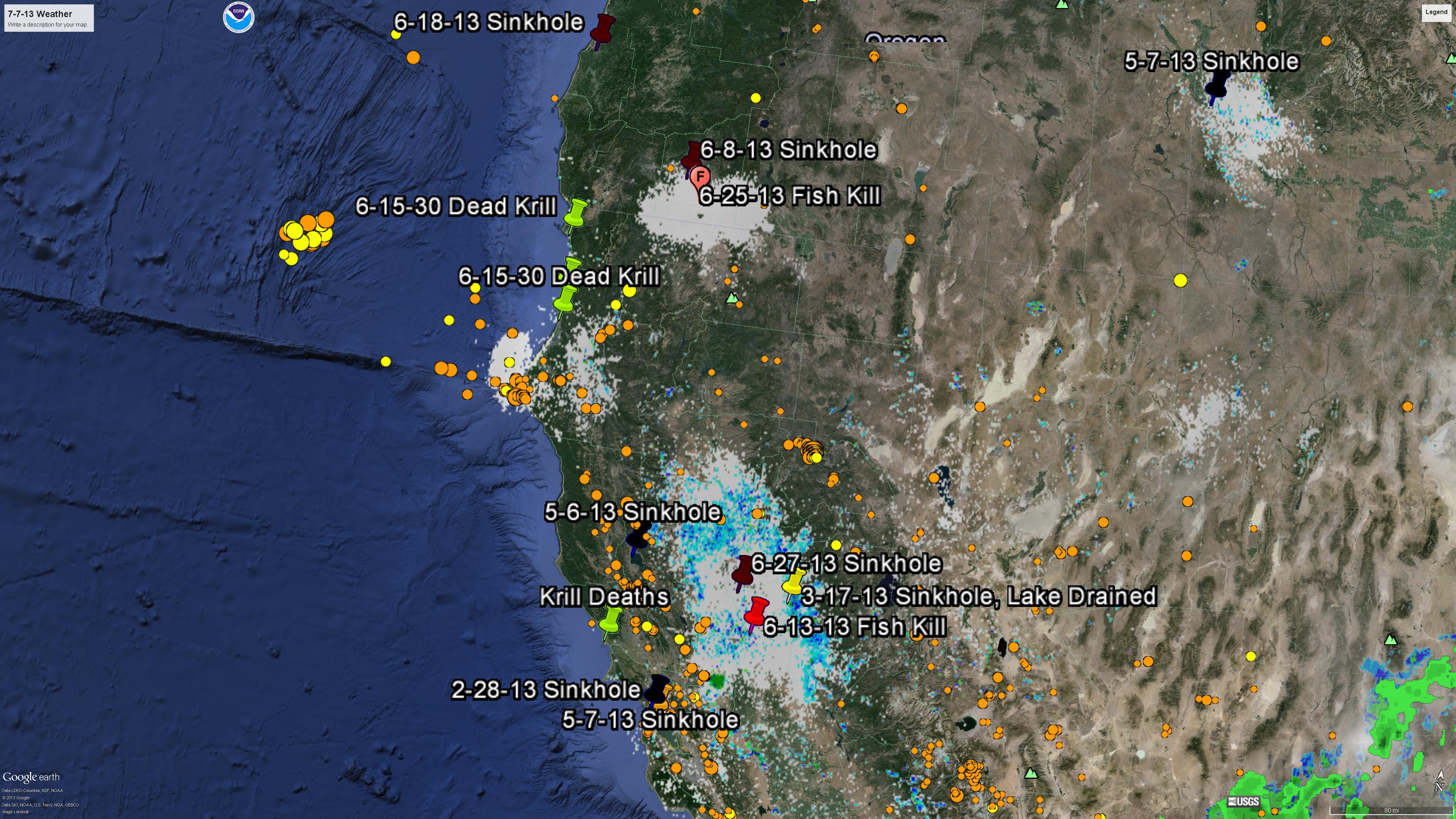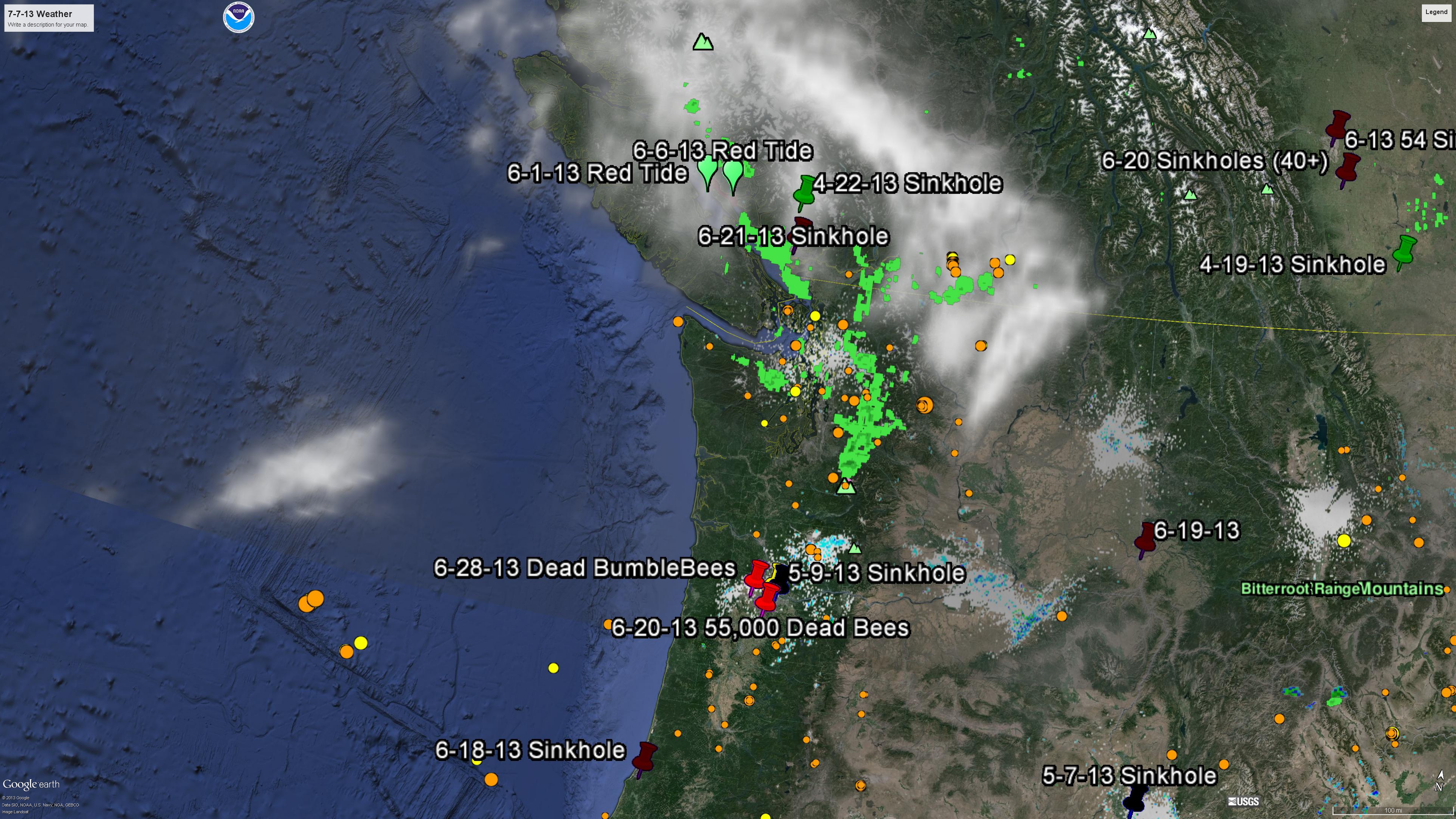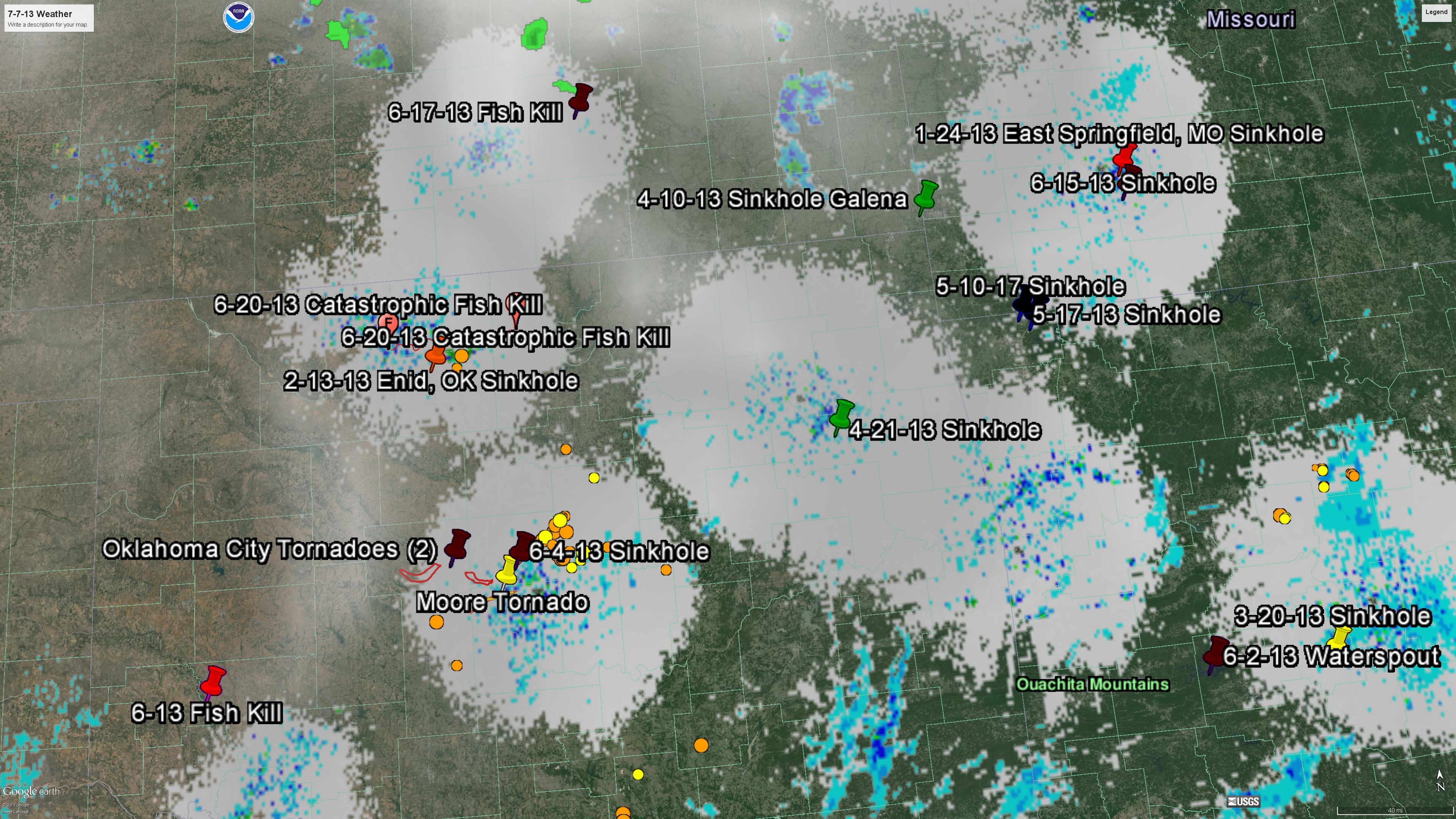 Here are some screenshots of doppler reflectivity over areas of fish kills, which also tend to have a higher frequency of waterspouts/tornadoes, sinkholes and red tide. These areas appear to stay “lit up for weeks”. They can be downloaded into Google Earth from here.