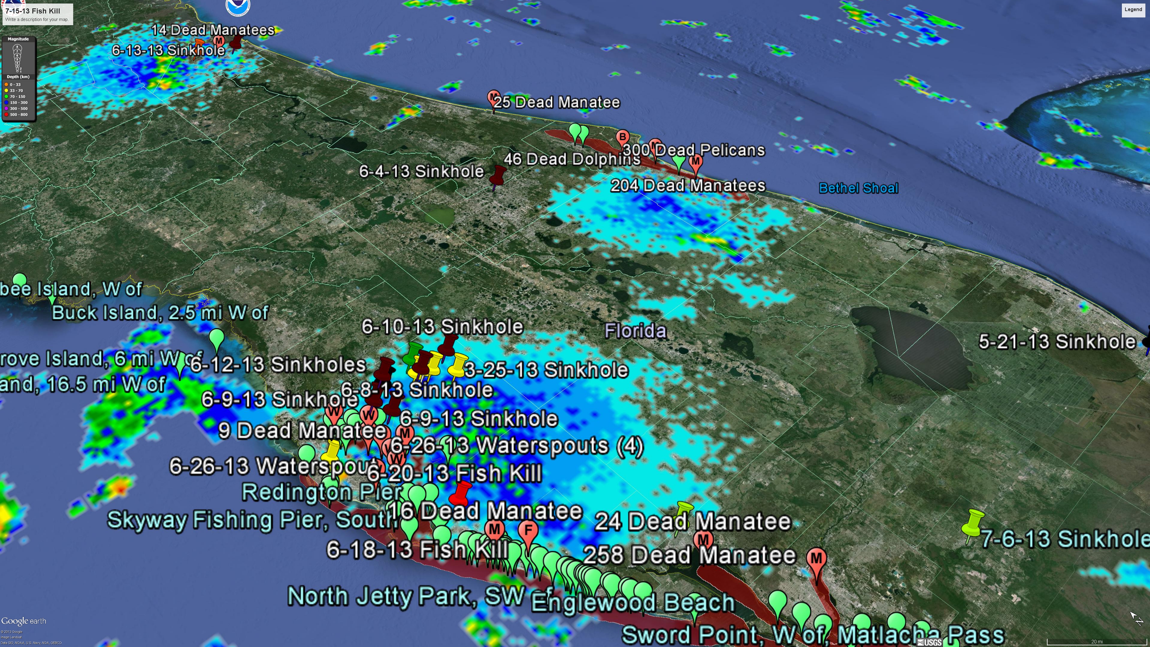 As soon as I started plotting fish kills I started seeing them in similar areas to many sinkholes, which I realize at first it is very hard to believe there is a connection there.  Of course people will excuse that and say that the rain is washing something like fertilizer or cow dung into the waterways, etc. and killing the fish.  Throw in some dead pelicans and manatees in Florida and some red tide all in the same area and 10 or so waterspouts and I really don’t know what to say other than that there is lots of bad stuff happening in those areas.  I realize some of those doppler signals are stronger near locations of the transmitter/receiver and may pick up false echo signals like June bugs mating in the air.  A fish kill was just reported today in Indiana and blamed on cow manure, which, who knows, might be correct.  Although when I zoom on in in Google Earth I get more anomalous Doppler activity with pretty much clear skies overhead (I checked, see below)