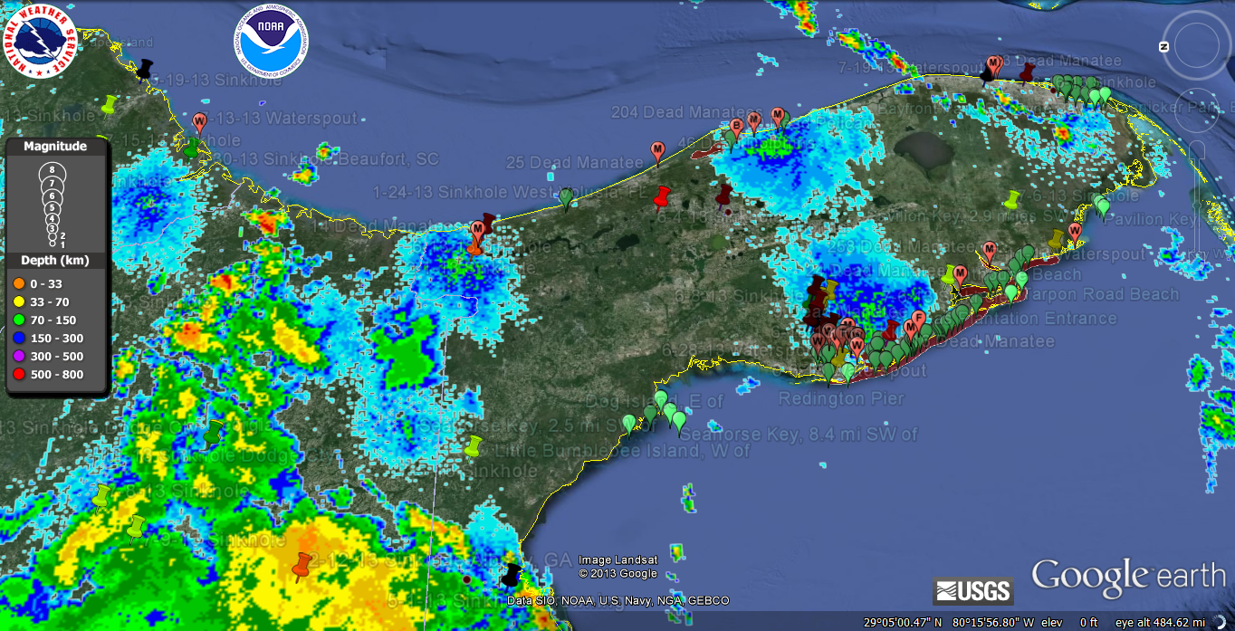 So at the bottom of this article is a Google Earth Screen shot of Florida from 9:40 PM this evening, and you will see even clearer that the Doppler Radar reflectivity continues to line up very well with red tide (Karenia Brevis) positive test sampling. It has been that way for the past few months I have been watching. Now you should ask yourself how on Earth is the weather, which according to most textbooks is primarily puffy clouds and water with a little lightning thrown in, killing hundreds of Manatees, dolphins and pelicans that spend much of their time underwater.
