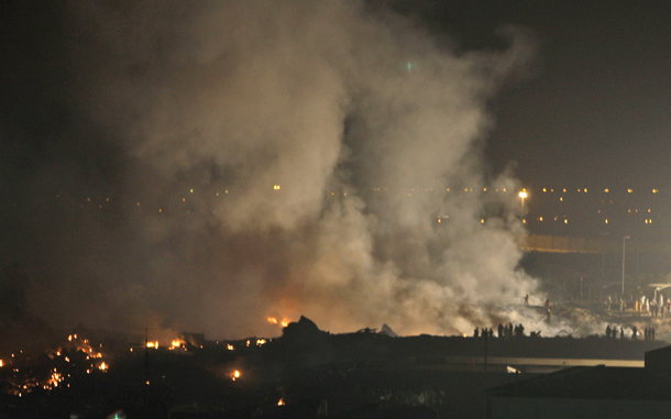 Smoke rising from the site of a cargo plane crash in Dubai, United Arab Emirates on September 3, 2010. UPS cargo plane with two crew members on board crashed shortly after takeoff outside Dubai. (AP)
