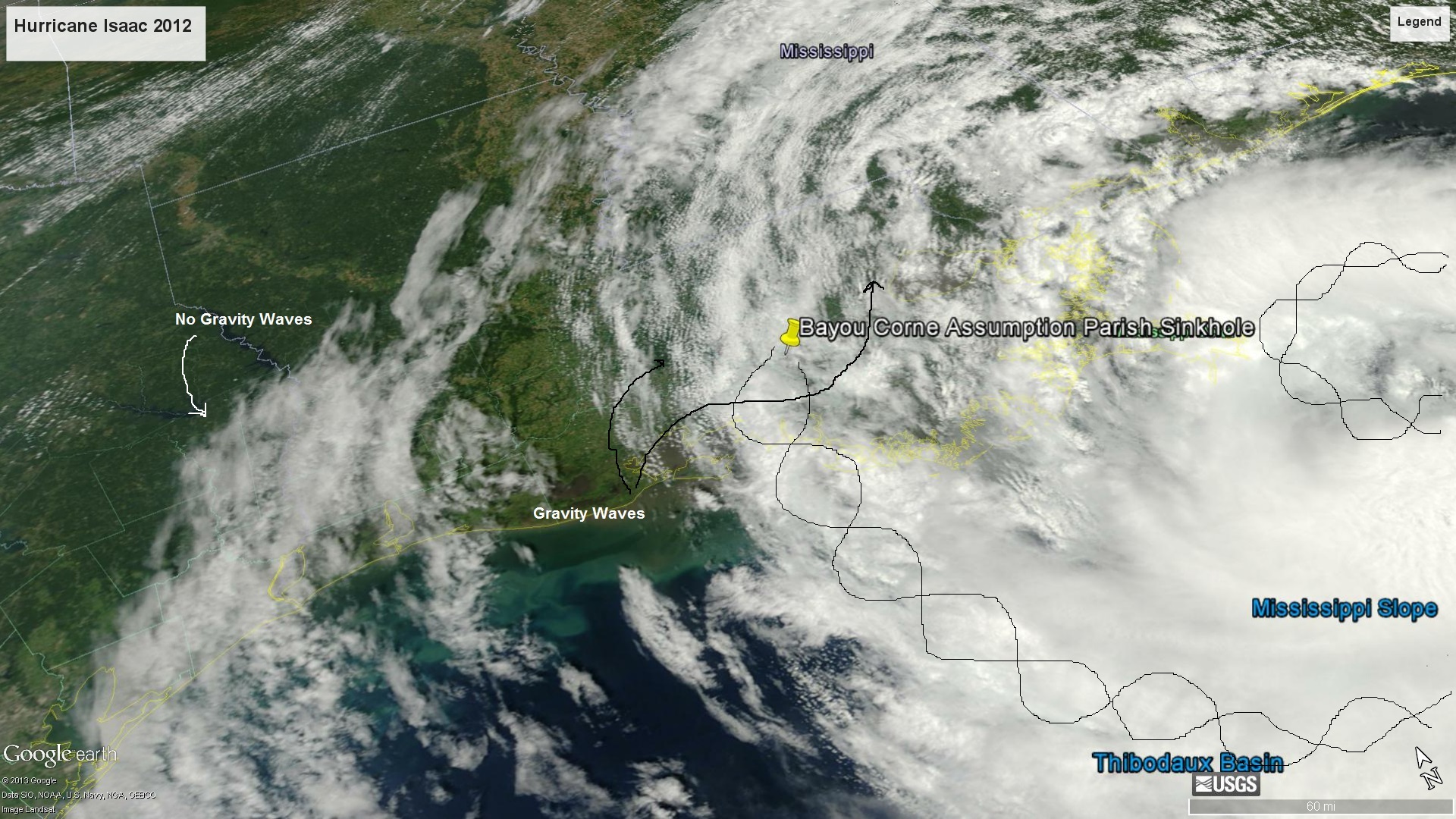 So as I go back and look at the NASA GOES satellite of Hurricane Isaac I see the same gravity waves I showed you that came off Hurricane Sandy. It just so happens these gravity waves are directly in line with the Bayou Corne Sinkhole whereas Hurricane Sandy’s gravity waves headed North, towards her FUTURE DESTINATION in New York. I believe this is where those strings of dark energy that are leaving the eyewall of Isaac are entering into the Earth. I have it in my mind there may be other strings entangled along the same path that may be entering the Earth further along the path and these low pressure disturbances move along the path of all of those tangled strings, which can cause the zig-zagging in a hurricane’s path.