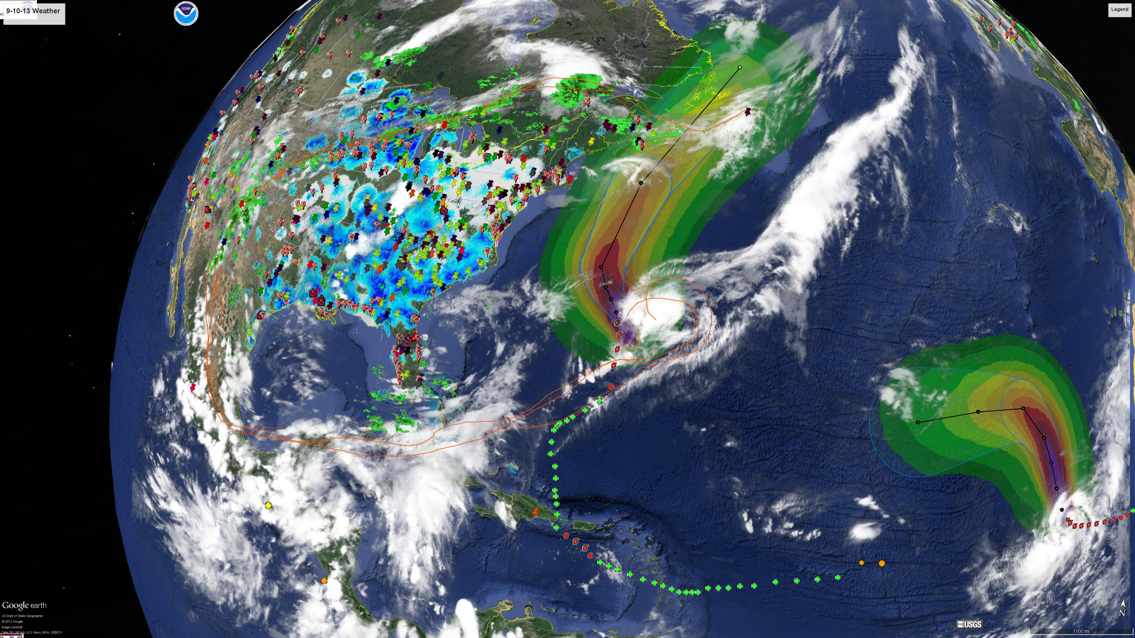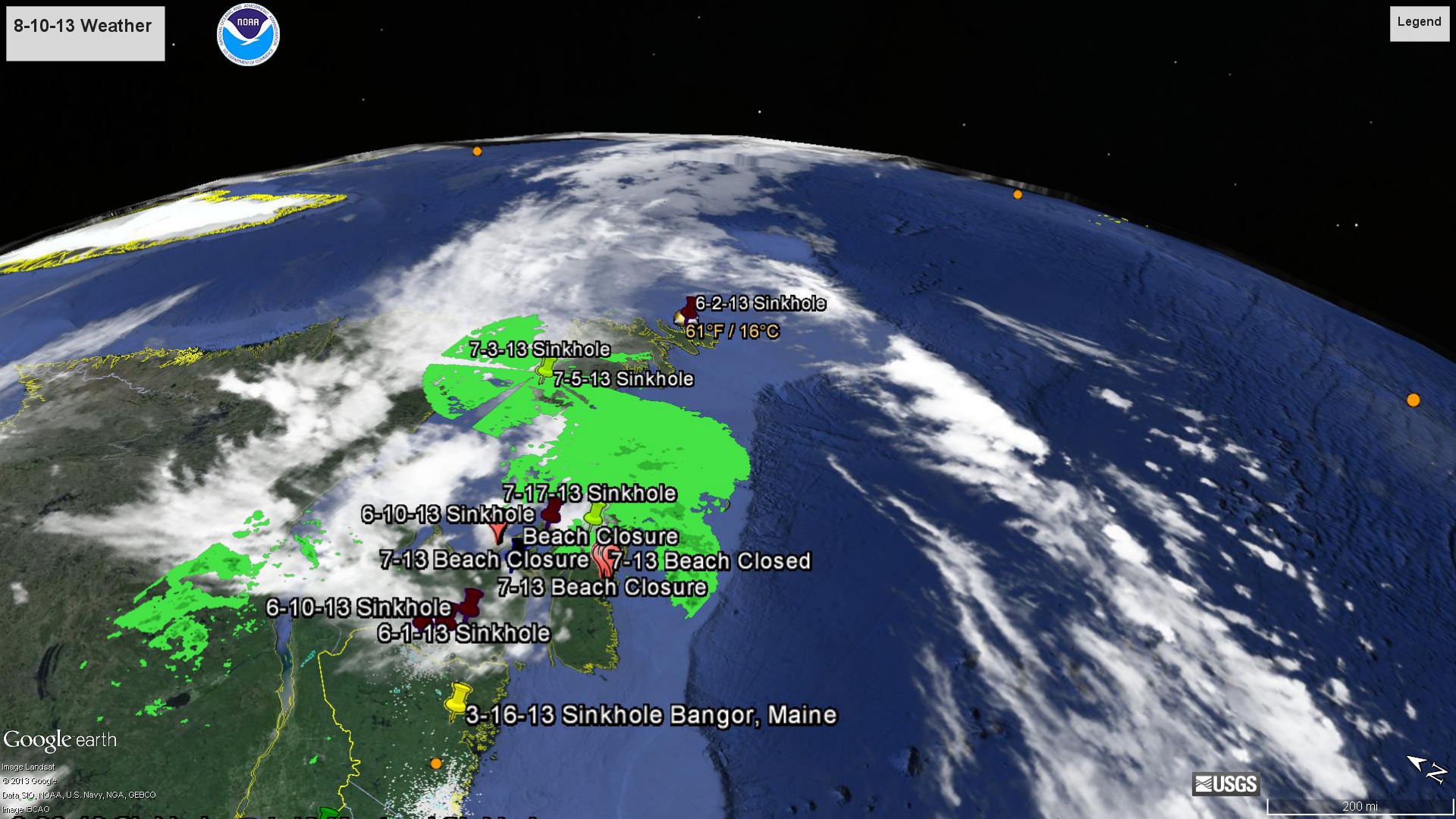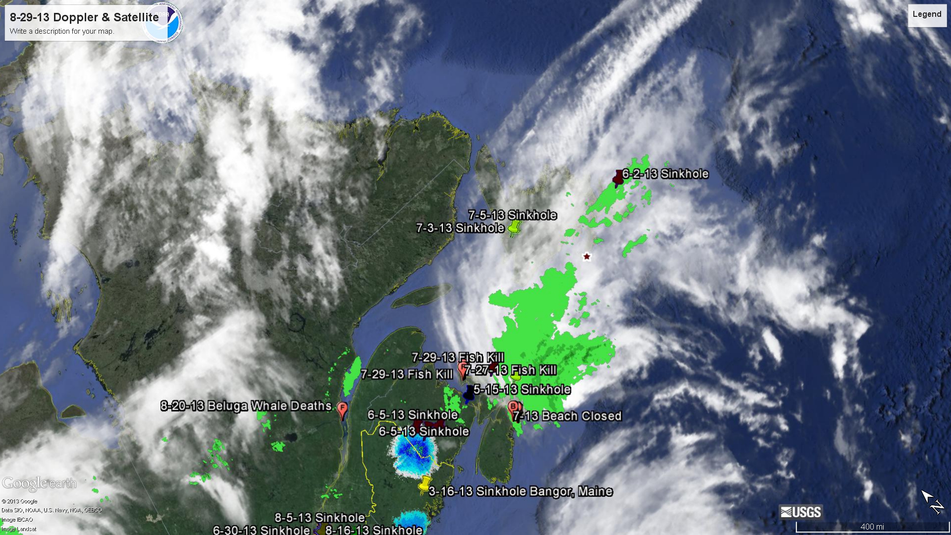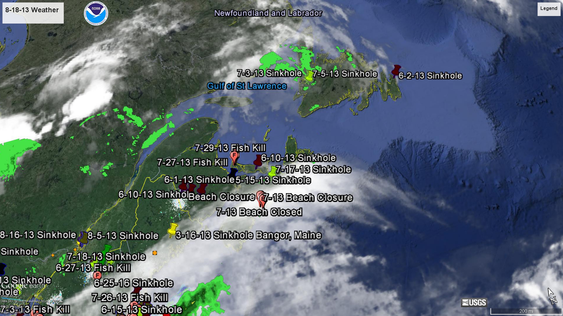 I put this graphic on my Google Earth Uncertainty Radar last night. I have included NOAA’s predicted track across towards New Brunswick, CA. Here is how I read those tea leaves regarding where that tropical storm is heading and where the strings are looping around creating the strong jet streams across the US as they ionize and condense the atmosphere as they loop around. I have been watching those sinkholes and fish kills in New Brunswick for the past month or so and I have put a few of those screen shots below (date is either in the filename or on the graphic. Look for that “cold front” to connect up with that low pressure system if they are connected, I have no way of knowing for sure other than eyeballing it.