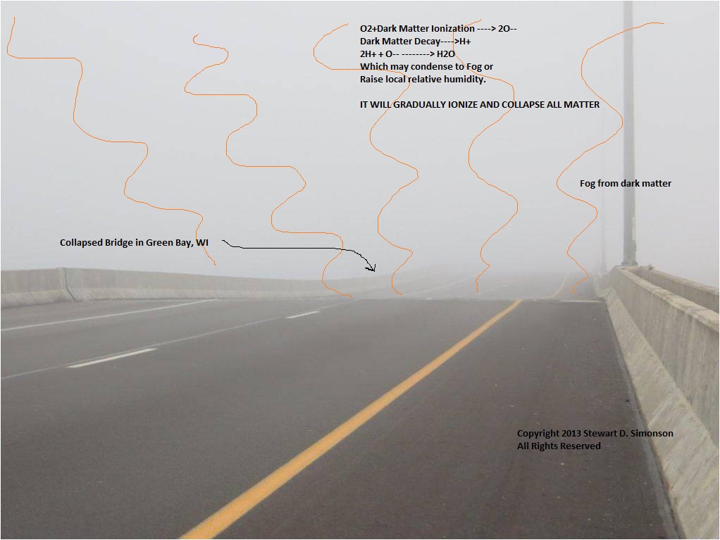 Here is a news broadcast on the heavy fog. The posting calls it “Radiation Fog”. The description by the newscaster is sorta goofy but he basically says the atmosphere is at the dew point – something has driven the relative humidity to 100%. That would be dark/vacuum energy decaying to protons and CREATING water vapor. It also ionized and DECAYED THE BRIDGE according to my wild ass theory.