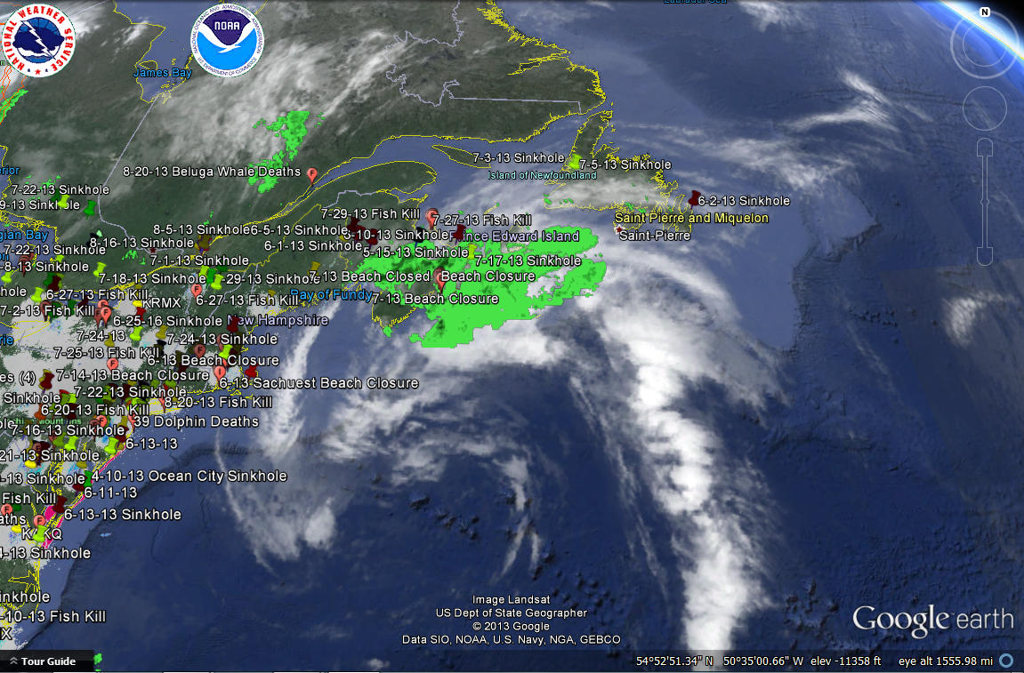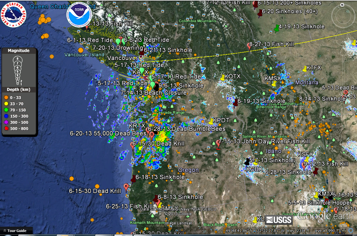 Lots of bad stuff in the Seattle area, earthquakes, fish kills, red tide, sinkholes, etc., fairly persistent. Look at the weather stringing towards those Doppler stations (yellow). Am I making that up?