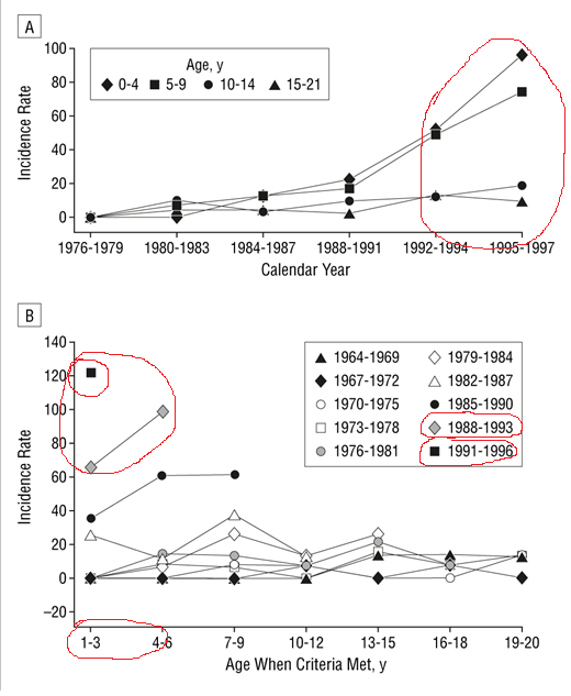Age-specific (A) and birth cohort–specific (B) incidence of research-identified autism among residents of Olmsted County, Minnesota, between 1976 and 1997. B, There is a separate line for each birth cohort. The birth cohorts overlap, since intervals were used for age and the year a child met the criteria. For example, a child who met the criteria at age 1 to 3 years from 1986 to 1988 could have been born between 1982 and 1987, whereas a child who met the criteria at age 1 to 3 years from 1989 to 1991 could have been born between 1985 and 1990.