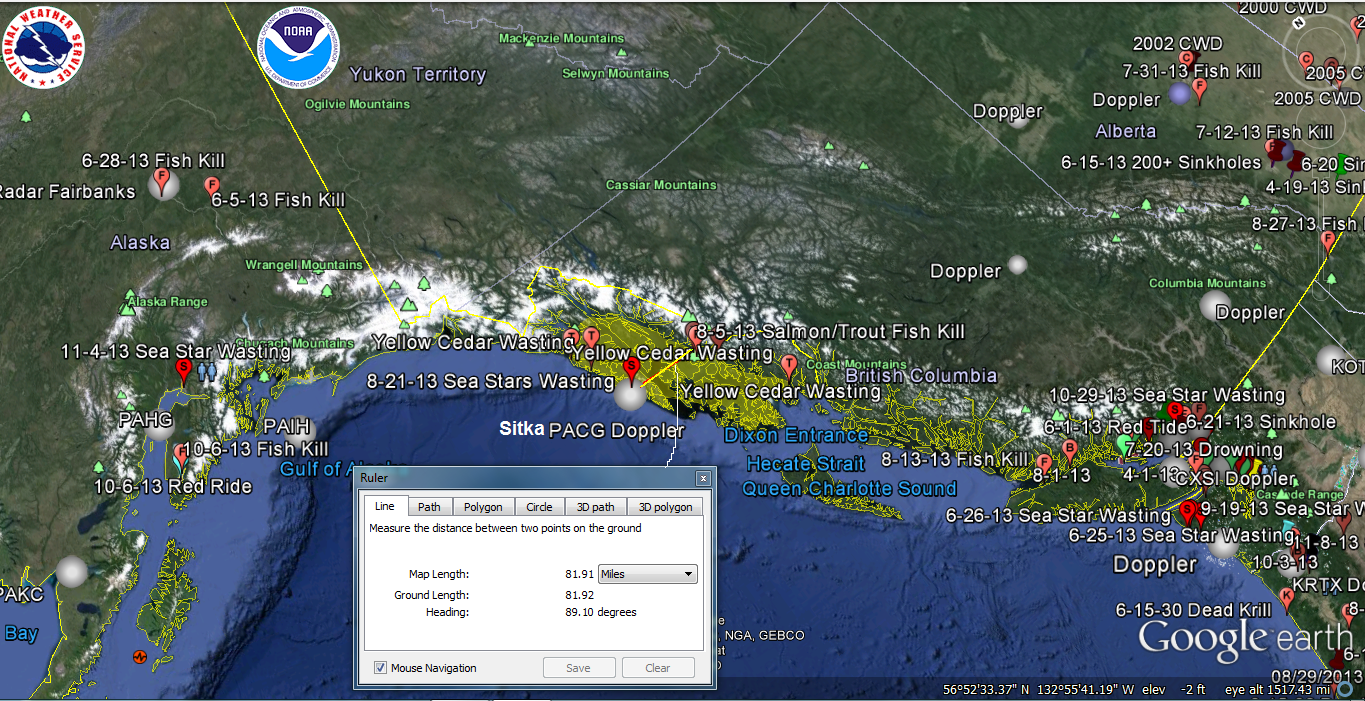 Yellow Cedar Wasting within 100 mile radius of Sitka, Alaska Doppler Microwave Radar. Wasting sea stars and fish kills in 2013 also within range.