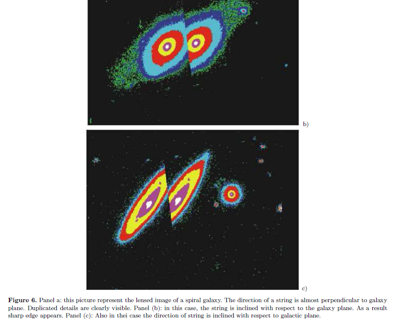 I grabbed a couple of images from this research paper.  Full credit to the authors, I am just the explorer.string lensing