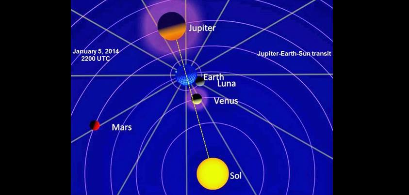 So my point is this, the reason for our current severe/cold weather is a combination of a few factors 1) I think ISON increased the local vacuum concentration in our solar system at the end of November, witnessed by all of the ice halos seen over the past month I believe are gravitational lensing and 2) we are TODAY passing directly between The Sun and Jupiter. If there is a quantum vacuum field connecting Jupiter to the Sun within Jupiter’s solar wind it HAS TO PASS THROUGH AND OR CLOSELY BY THE EARTH TO GET THERE today.