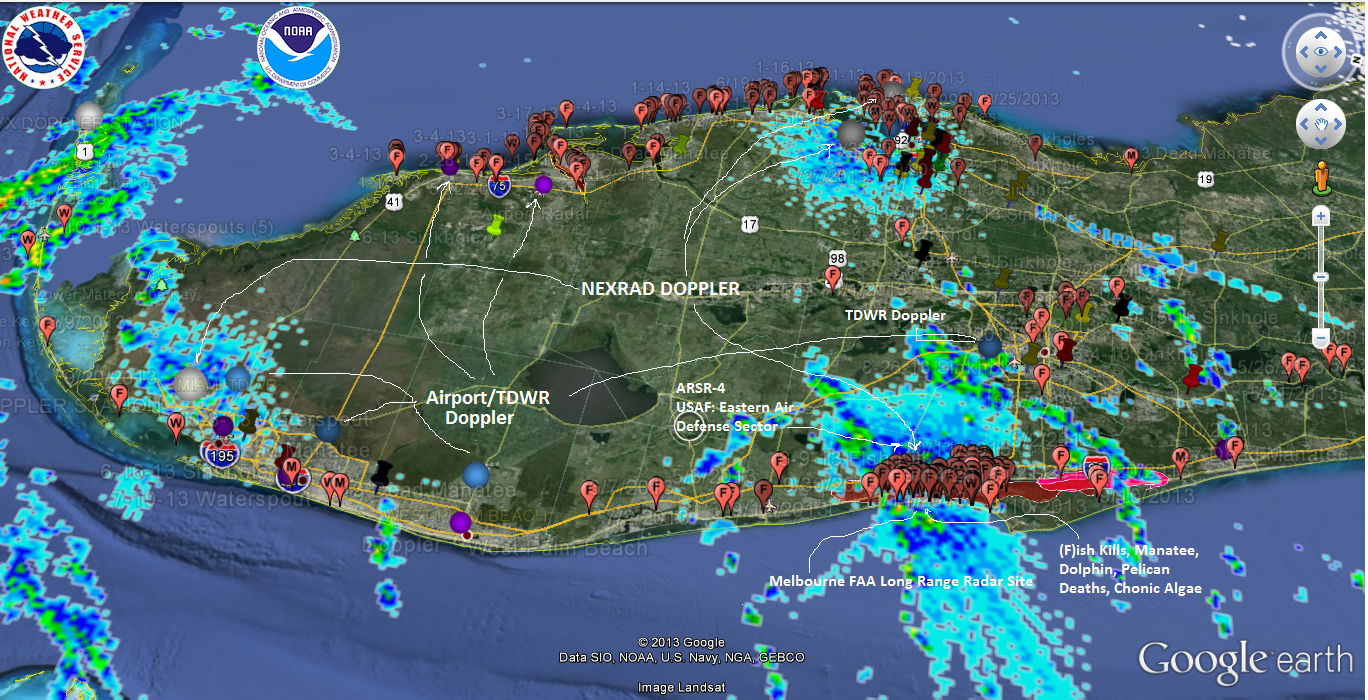 2014 Manatee and Fish Kills Deaths. Manatees continuing to show signs of SHOCK. Round red circles are pulsed microwave radar locations.  Blue/Light Blue is the 2.7 GHz Microwave reflection back to the local NEXRAD radar in the area.