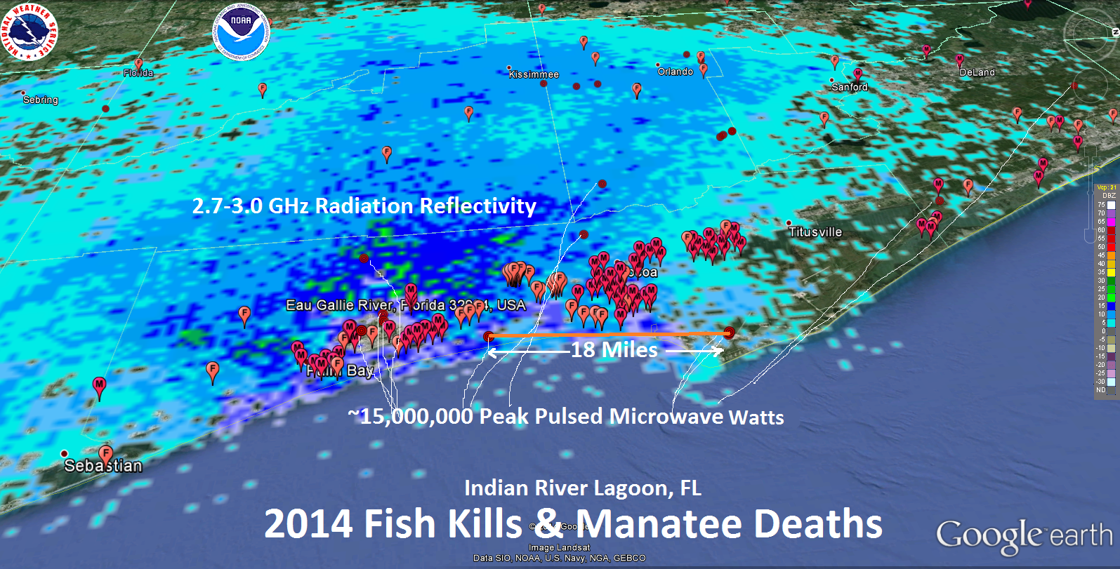 2012 & 2013 Indian River Lagoon Dolphin, Manatee and Pelican Deaths associated with moribilivirus, tumors, shock and disease. 17 high power, pulsed microwave radars in the area (~ 23,000,000 peak pulsed watts, 2 trillion EIRP Watts). Also site of tens of thousands of fish kills associated with hypoxia, disease, tumors, cyanobacteria