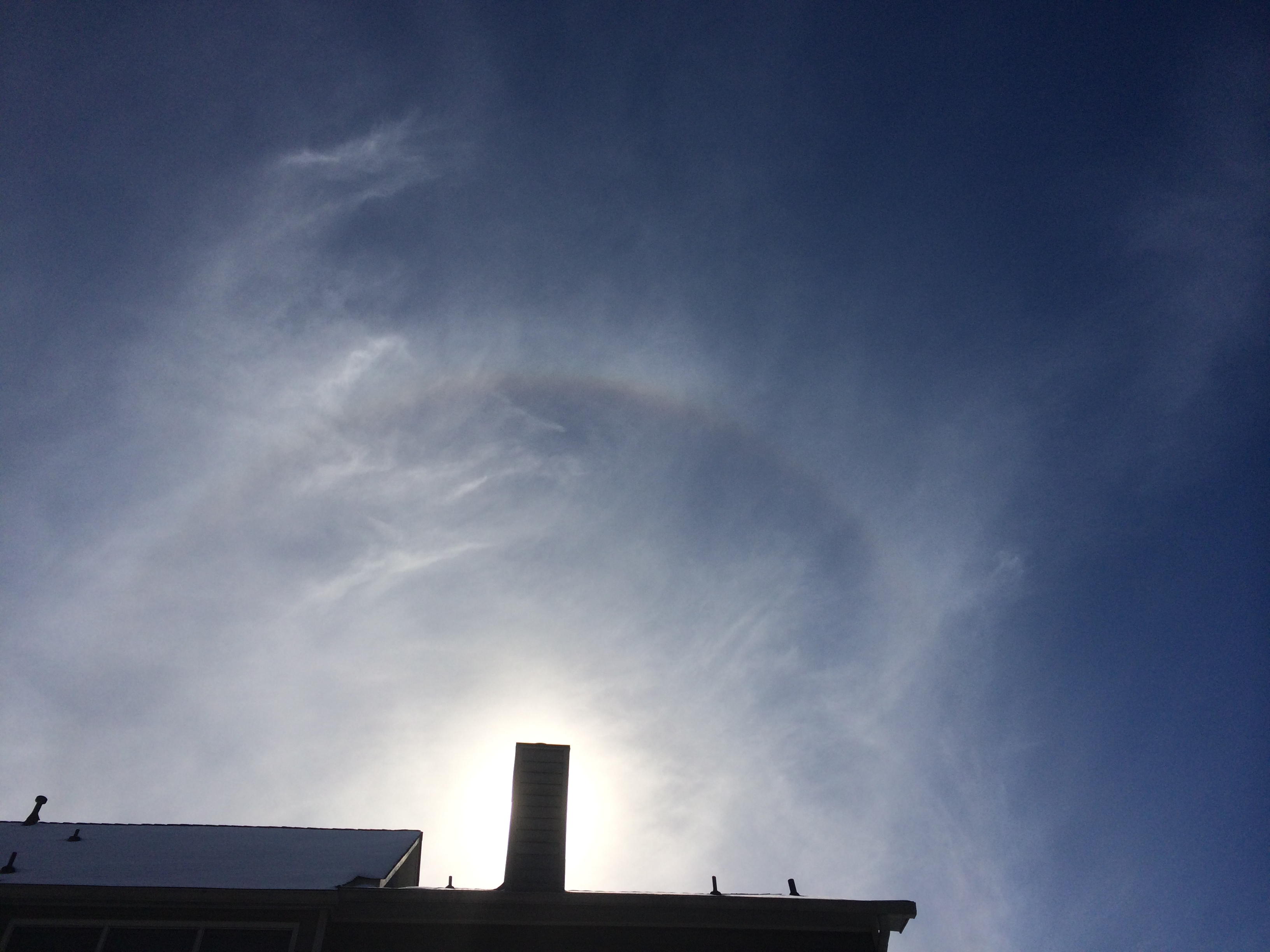 I am a little foggy today, I got caught up in that quantum uncertainty yesterday in Atlanta, I spent 9 1/2 hours in traffic (a trip that usually takes 40 minutes), because a low pressure system snuck up on Atlanta and left an inch sheet of ice on the highways within the period of just a few hours. I walked the last 1/4 mile to my home at 12:45 AM this morning. So I got up this morning and went sledding with the boys, but I could not help but look at the overhead Sun. What I noticed was all of the whispy cirrus clouds oriented towards the Sun and the Ice Halo and Sun Dog around it.