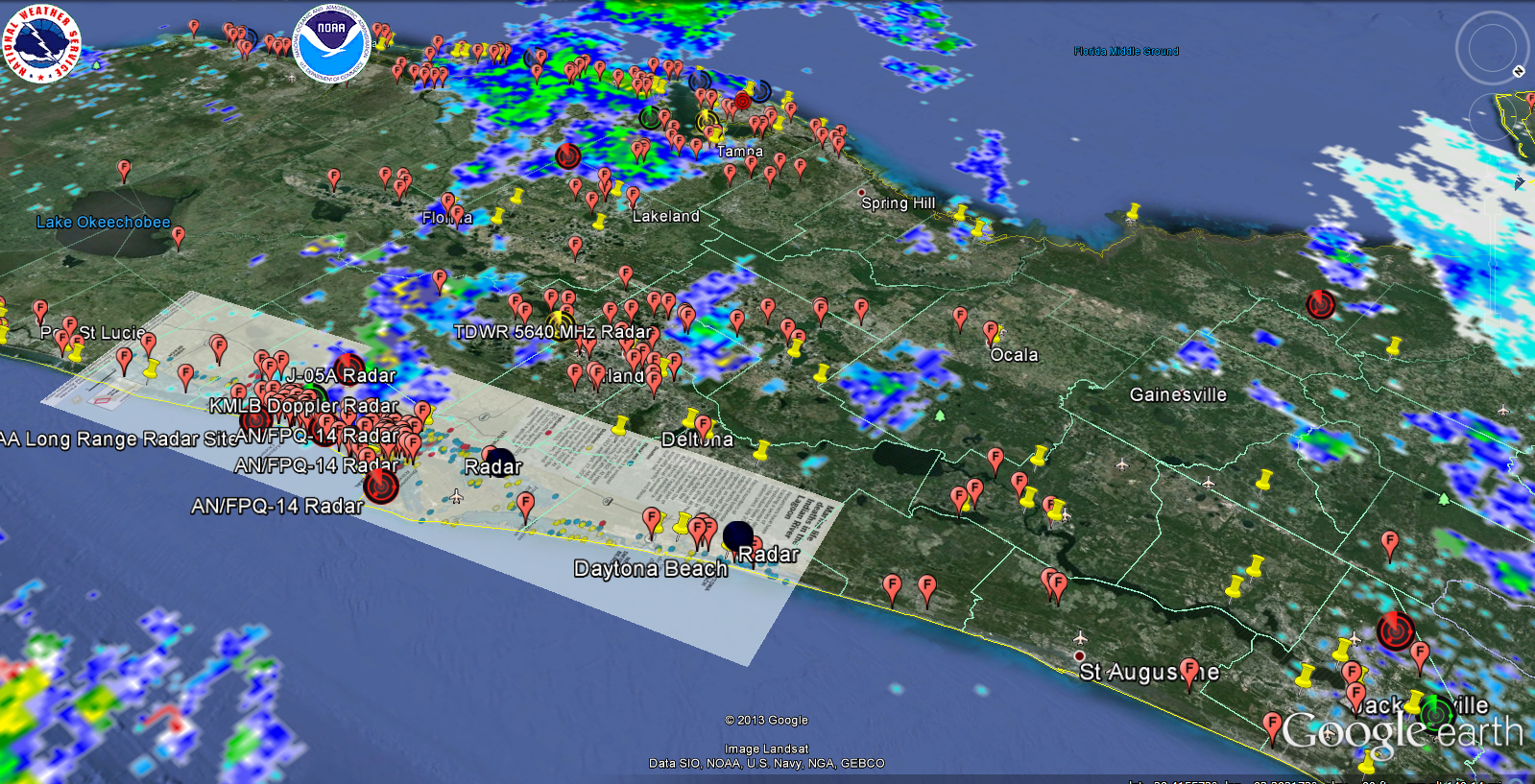 (F)ish Kills Due to Chronic Algae/Red Tide/Hypoxia 2012/2013 and Unknown Causes/Lesions(Yellow Pins). Blue Manatee Deaths, Yellow Dolphin Deaths, Red Pelican Deaths. All within a few miles of 6 high-powered, pulsed Governmant, Military and Weather Radars (3,000,000-10,000,000 watts power est.)