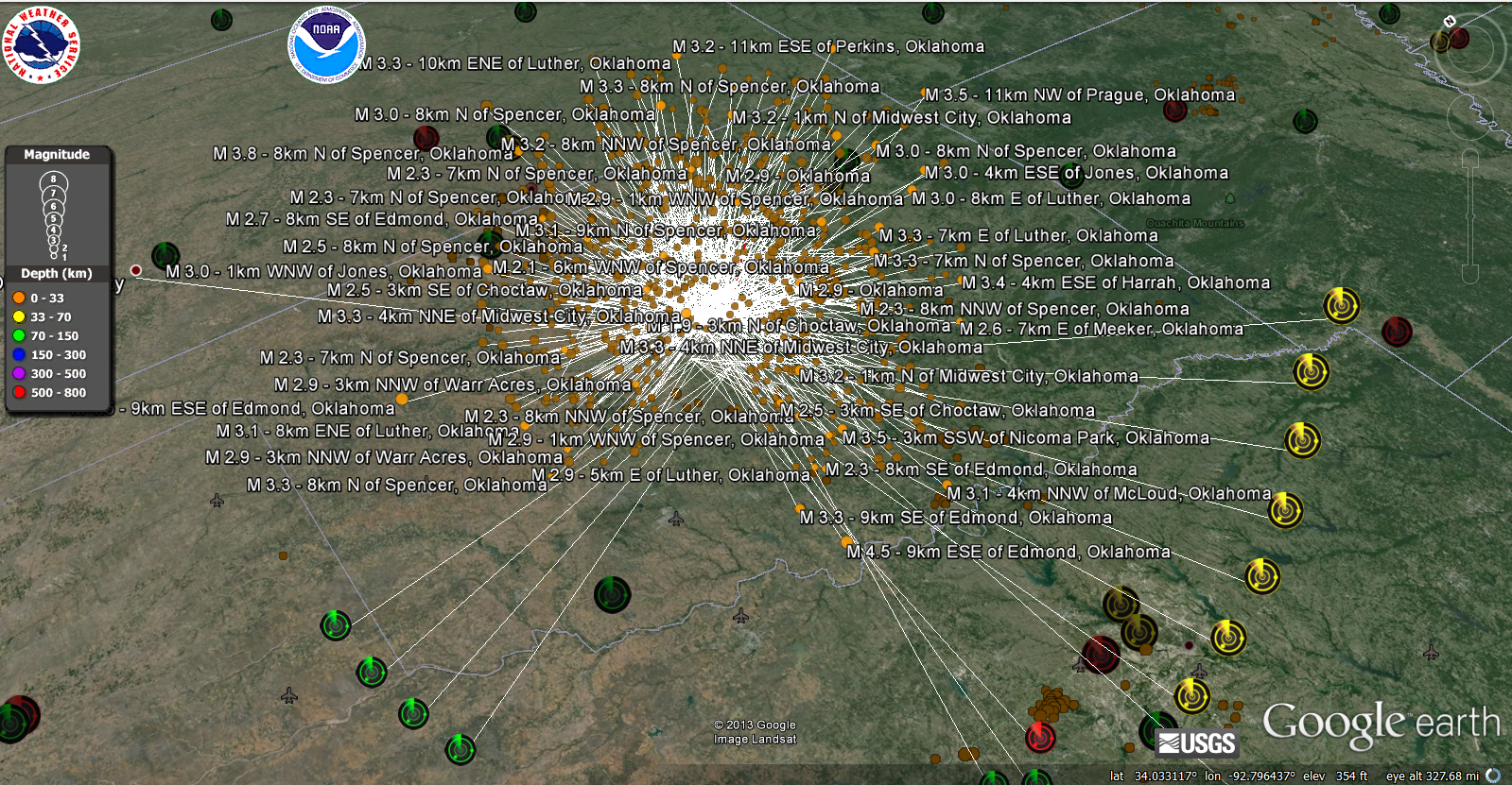 The earthquakes continue within 50 miles of those seven or eight radar towers overlapping in the Oklahoma City area and, well if you take a look at California, which also has the highest radar concentration along the coast, it has had thousands of small, shallow earthquakes over the past year. I know, they have fault lines, bla bla bla. Who knows, maybe some of those little ones might help prevent the “big one”. Maybe California will “just crumble” into the ocean one day, maybe leaving a big sinkhole. Not to mention all of the starfish dissolving, butterflies disappearing, seal pups wasting, krill dying, etc. What a f^&$’n mess we have humans have made. Enough ranting.