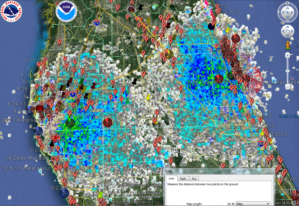 2-19-14 Florida Doppler Reflectivity, (F) 2012/2013 Fish Kills Due to Hypoxia/Red Tide/Algae, Pins are sinkholes, (W)aterspouts, (M)anatee Deaths.