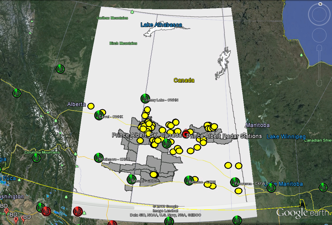 Green Circles are Weather Doppler Microwave Radars. Grey areas are Chronic Wasting in Free Ranging animals. Yellow is Chronic Wasting in Captive Animals