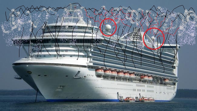 I guess it is pretty obvious I have developed a severe aversion to pulsed Doppler microwave radars during the course of my research. I realize they are used to “protect” humans from “weather” and used in aviation and to protect us from bad guys (ourselves?) in the military and such, but is the price we are paying for this our health? It appears to me they have parked those Doppler radars right over the passengers on those cruise ships, overlapping multiple radars hidden inside those round radomes. That radiation is bending and reflecting off “weather phenomena” and other ships. So what happens when a ship goes into a “fog bank” which is very common over the ocean when there is an “inversion” (see my previous posts on those what causes those)? Does all of that microwave radiation get attenuated locally and right back into the ship and those passengers hanging out and swimming in the pool right below the radars? And what if that radiation triggers a similar hypoxic condition in bloodstreams of those passengers like I am seeing in Florida in the Indian River Lagoon around those local 7 or 8 microwave radars? Here is the latest high seas high jinks: