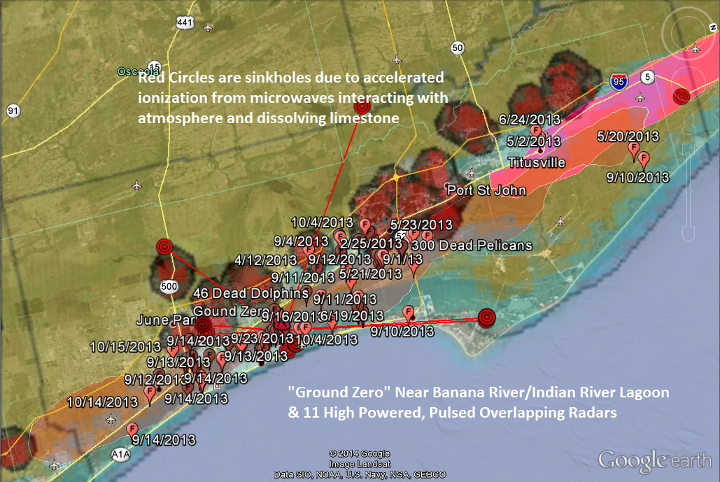 (F)ish Killed due to hypoxia/algae. 11 high powered overlapping pulsed microwave radars. Also a bunch of sinkholes (red blobs) in the area – SOMETHING IS DISSOLVING CaCO3 in the area.