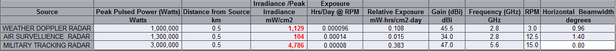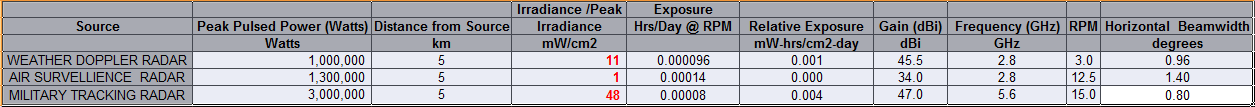 3) Radar pulses are not on for very long so the accumulated exposure is typically lower than other sources. Radar guys will average these pulses over a second and tell you they are low power, that is FALSE and VERY MISLEADING.