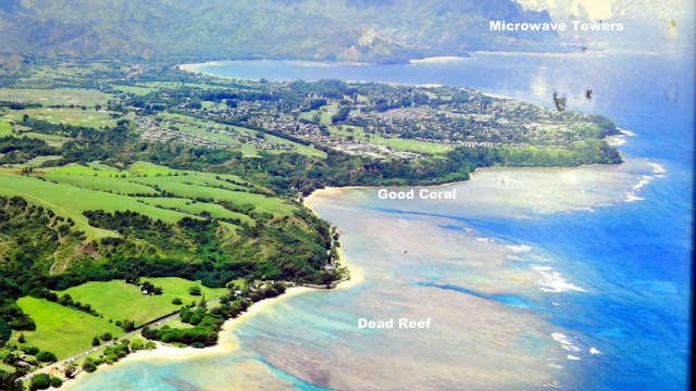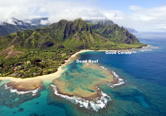 I have now found this scenario all along the north shore. The only healthy reefs are right in front of high bluffs that block the radar tower transmissions! This includes coves down in Kalalalau. If this is just a coincidence then it is one for the record books!