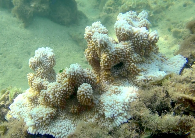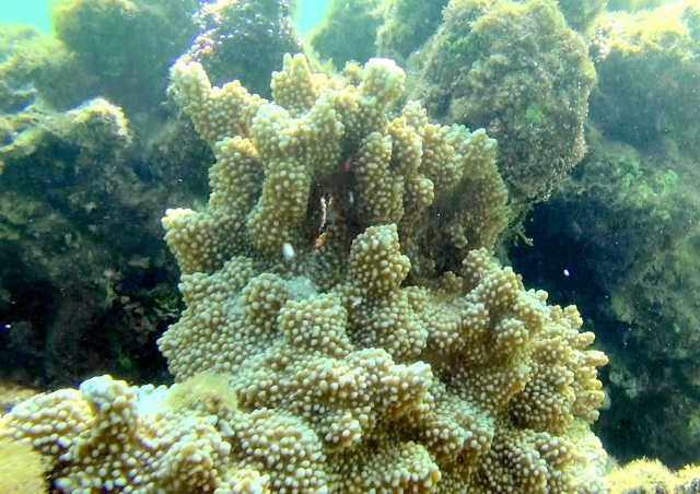 Down past the river is a small cove that is sheltered by the tall coastal bluffs. This is the area where the polluted creek washes into, and the nitrates and sewage from Princeville empties out into this part of the reef.