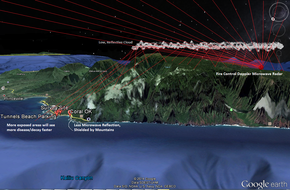 If I am wrong and some other monster from the black lagoon is killing our giant old corals along the north shore of Kauai and it is not the military then, please fill me in on this phenomenon! I cannot find even one coral biologist on planet earth that can figure out why the corals are all dying in the areas that are directly impacted by the Navy Radar and Sonar, but are alive in areas that are blocked from these dangerous frequencies.