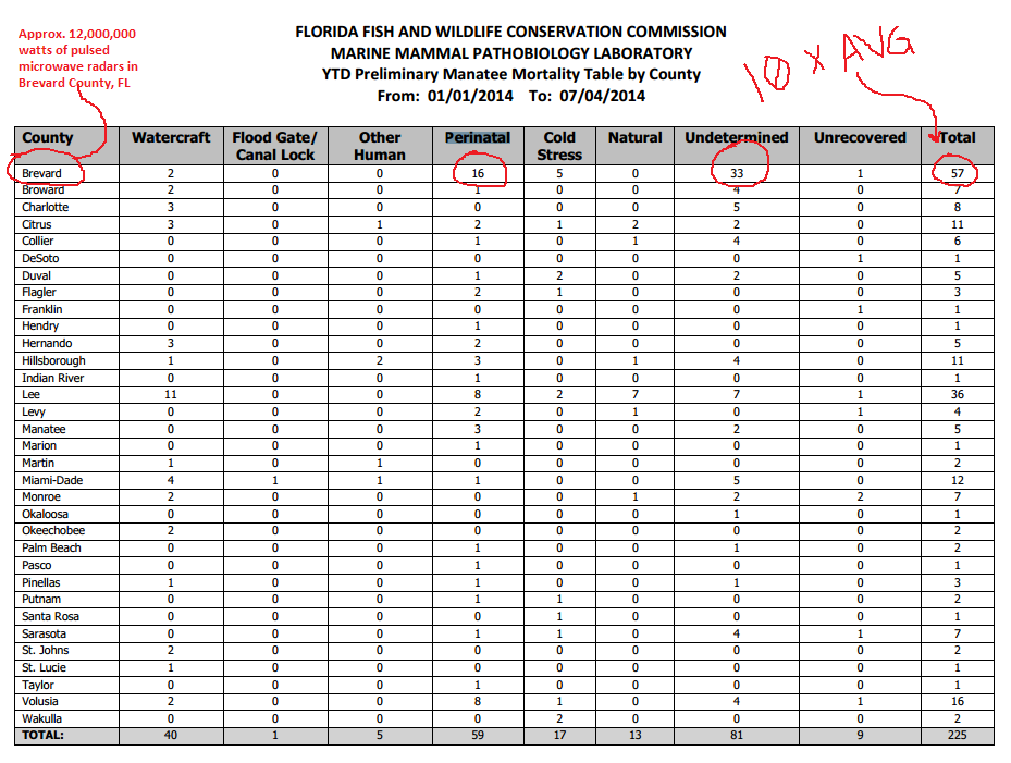 Brevard County, FL 2013 Wildlife Deaths & Radar Locations. (F)ish Kills due to hypoxia, disease assoc. with algae blooms. Multiple Cancers, tumors in wildlife. Some mammals also showing signs of shock.