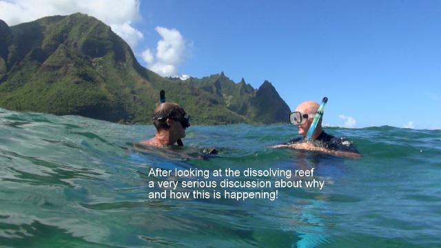 Our snorkel dive along Ke’e beach was very revealing. As we snorkeled along the inner reef it was apparent there was very little sea life such as schools of fish which would typically populate a reef of that size. Also, within the first three feet of seawater, the coral calcium carbonate skeleton appeared almost 100% dissolved and/or disassociated. The top of the reef appeared almost leveled off like a shelf, covered in a mossy green algae. The calcium carbonate structure that remained