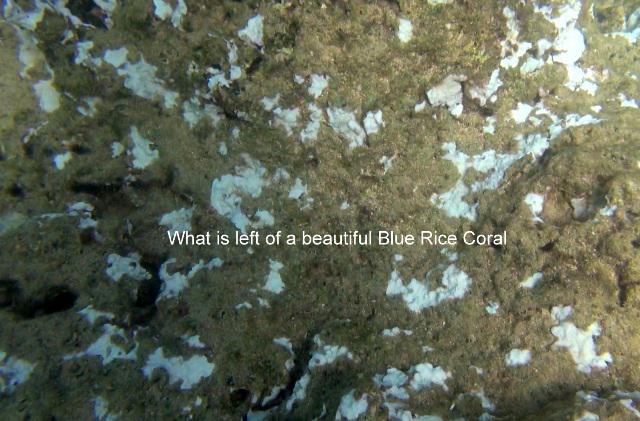 would just crumble in your hand in places whereas it typically is strong enough to withstand intense wave action. The remaining corals at levels 3 to 20 feet appeared to be 60-90% diseased with brown patches of decay and patches of cyanobacteria disease widespread.. The blue rice corals , which typically cover areas continuously for a few feet in diameter, were broken up and very patchy with dissolved areas in between. The visibility was also low, approx 10 feet with a high visible concentration of suspended solids, probably from the dissolving reef.