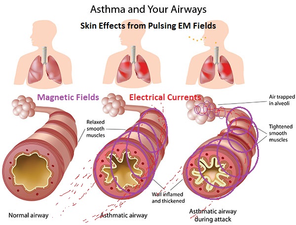 EMR Skin Effects from pulsed electromagnetic radiation damaging the lining of airways, veins, arteries, etc. increasing asthma, lung cancer and disease.