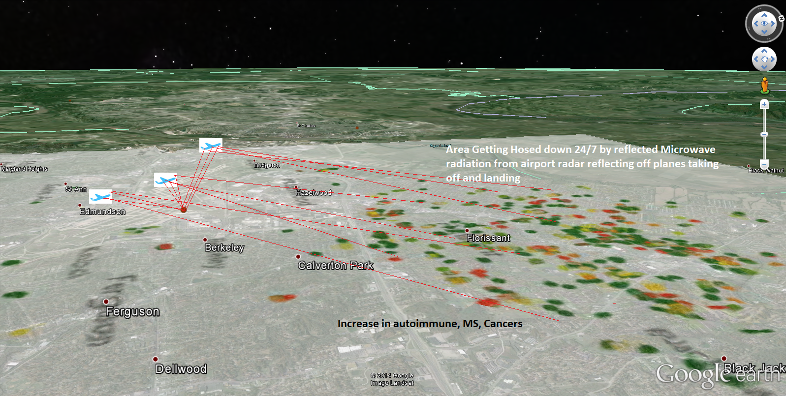 Max Pulsed Power Density @ 2 miles from radar = 25.4 watts/sq. meter. That is doing the damage. Since the radar is close to the runway I think the radiation is bouncing off the airplanes and back to the surroundings 24/7