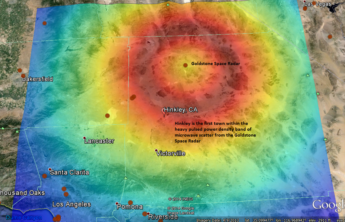 Scattered microwave radiation band from extremely high gain, high power Goldstone radar. Simulation: 30,000 ft Cloud avg. scatter, 10 degree dish angle. Non-isotropic radiation profile.