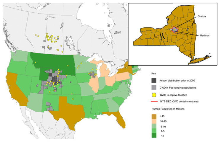 The emergence and continuing spread of Chronic Wasting Disease (CWD), a prion disease in deer and elk, has now reached 14 U.S. states, two Canadian provinces and South Korea, producing a potential for cross-species transmission of CWD prions to humans and other animals globally. In 2005, CWD spread for the first time from the Midwest to more densely populated regions of the East Coast. As a result, a large cohort of individuals attending a wild game feast in upstate New York were exposed to a deer that was subsequently confirmed positive for CWD.