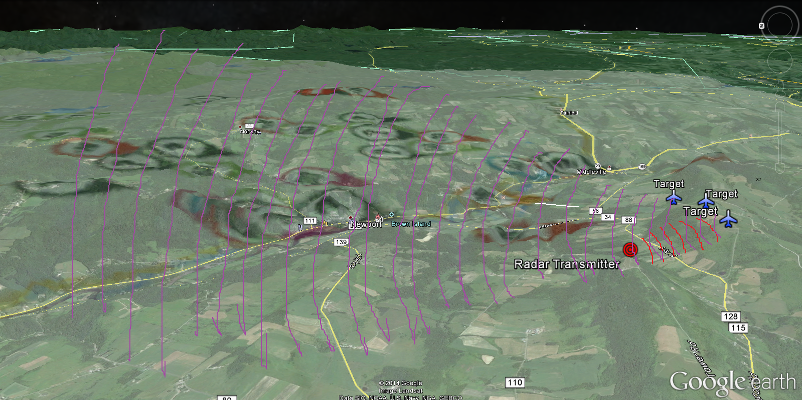 High Powered, High Gain/EIRP reflected microwave radiation off target back towards town. Red is transmitted, Purple is Reflected microwaves. Disease cluster within 5 miles of the radar transmitter and targets