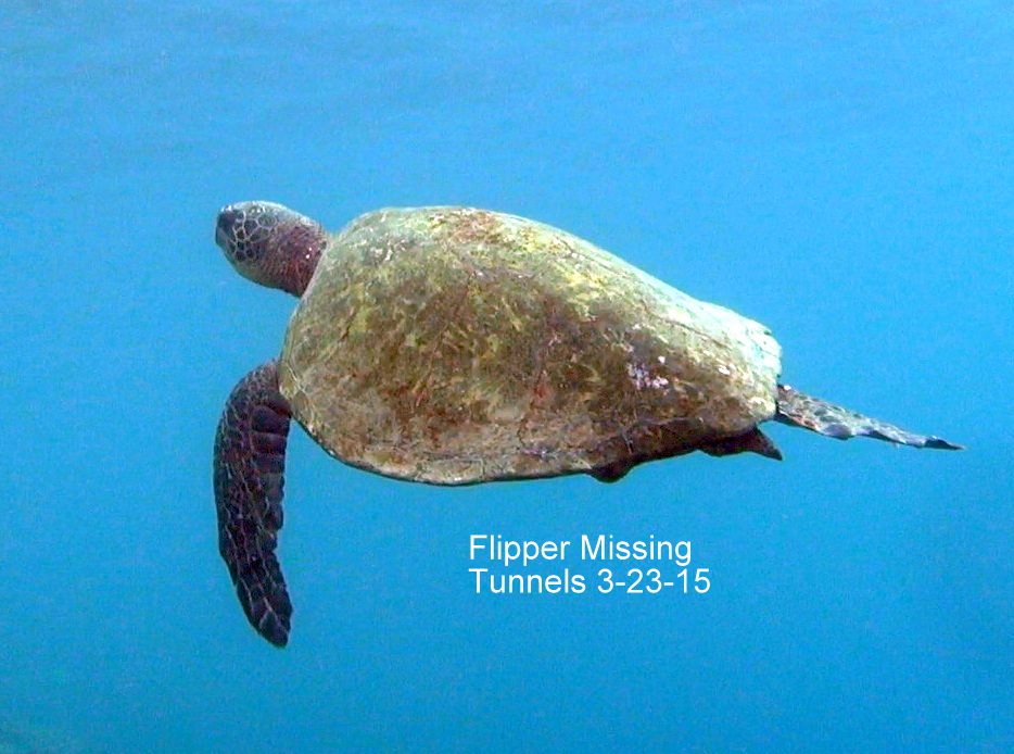 Endangered Green Sea Turtle at Tunnels Beach, HI with 1 1/2 flippers destroyed and damaged shell. Chief Government Scientists have it narrowed down to between something to do with a rare flesh eating bacteria or rising oceans…