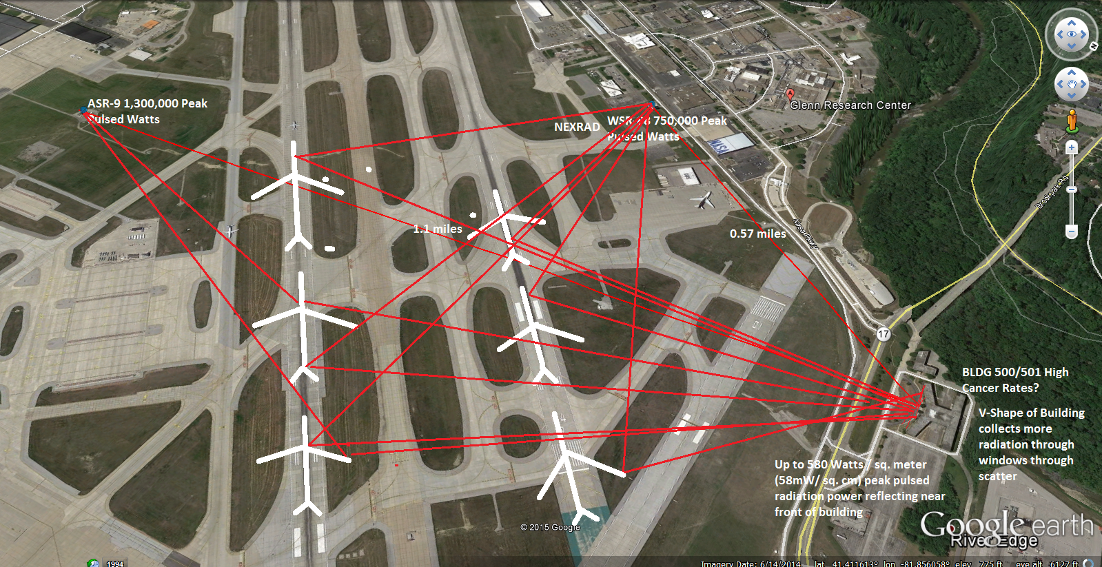 NASA Glenn Bldgs 500 & 501 faces two high power, high gain pulsed microwave radar stations. and had 40 people with cancer on the 3rd floor of the buildings  These buildings would see high reflected pulsed power density from aircraft landing/taking off due to the radiation. The V-shape would also gather more reflected microwaves