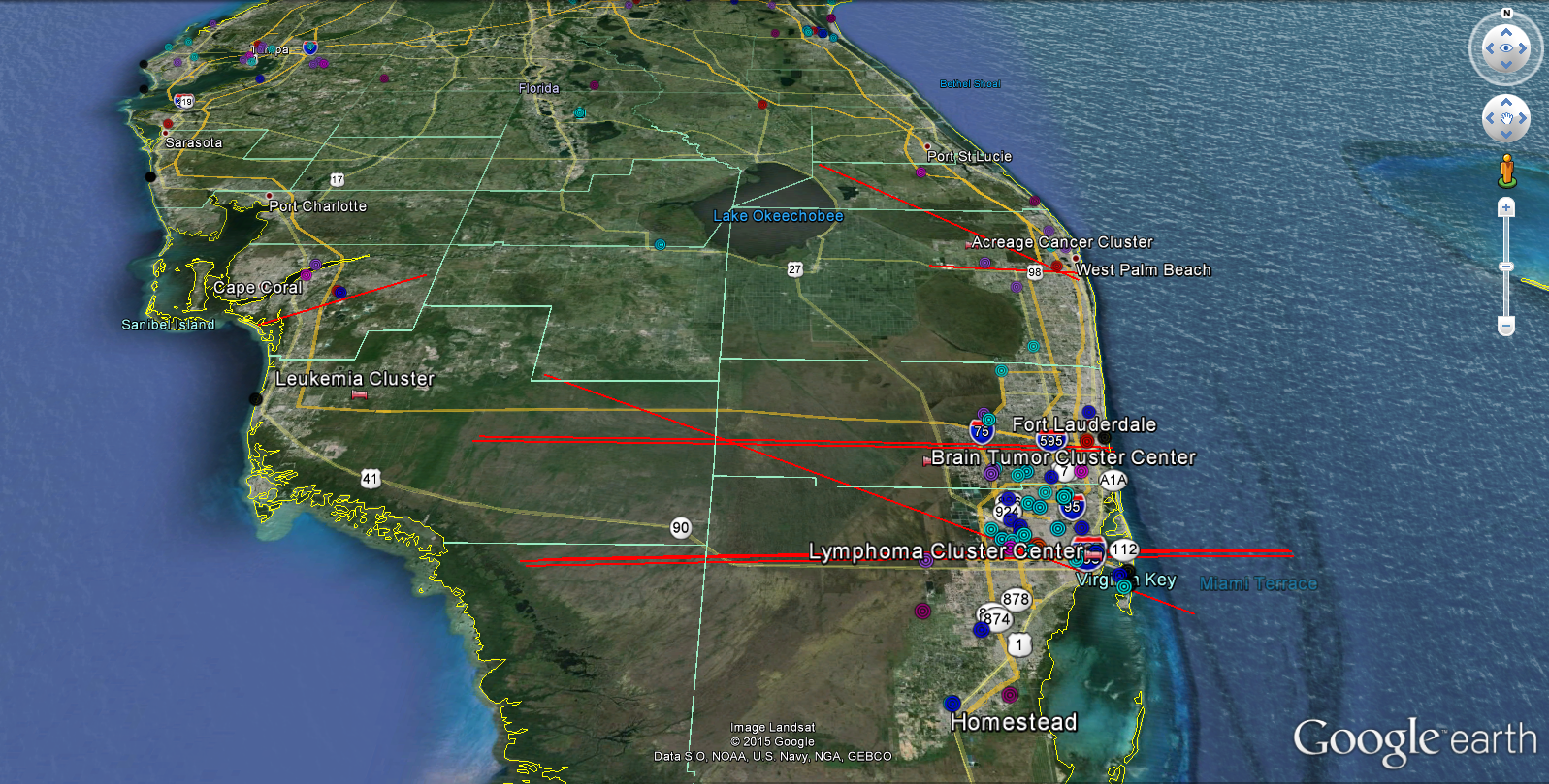 Red Lines Are Airplane Flight Paths. Light Blue Circles Earthstations. Red/Purple Circles FAA/Military Radar. Dark Blue Weather Radar. All generate high power, high gain radiation