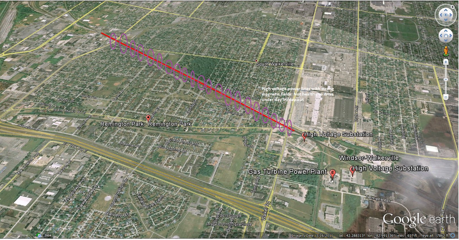There is a power plant directly beside Remington Park with a gas turbine and steam turbine generating tens of millions of watts of high voltage power for distribution. The power line runs right beside the subdivision with the cancer cluster.